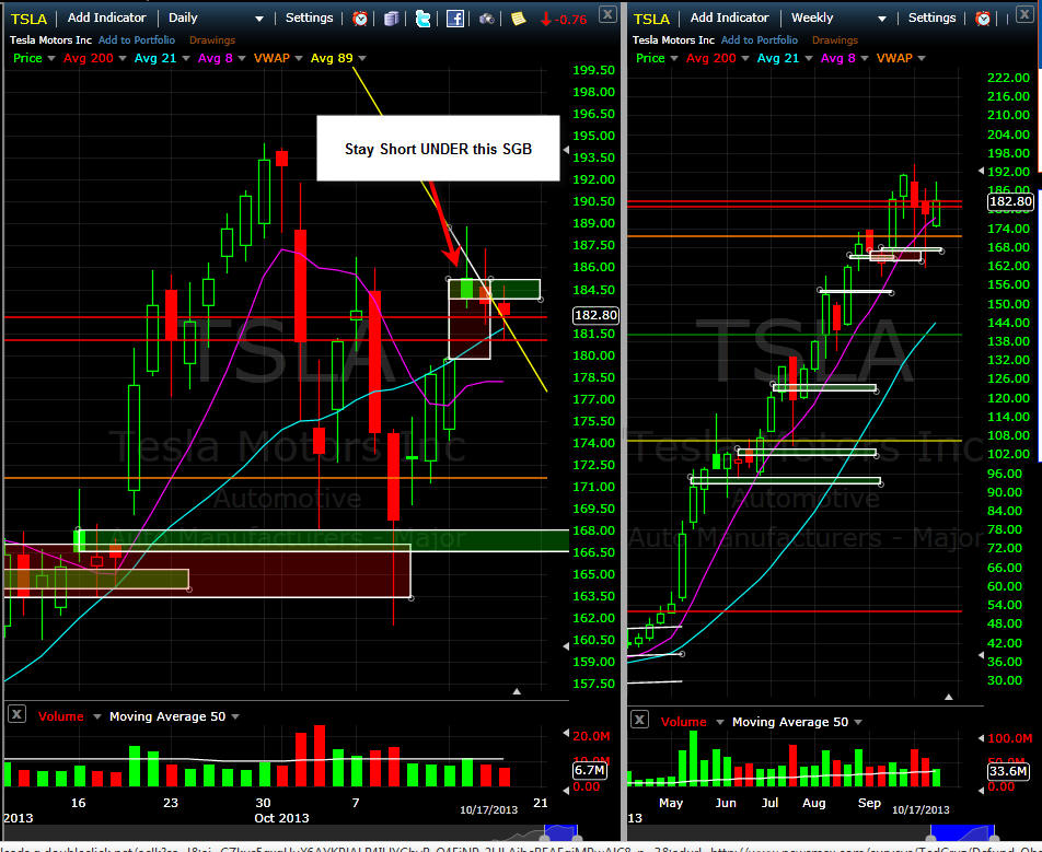============================================================================================== 10/17/13 - Markets at all time highs again and TSLA is NOT participating...yet. The chart is looking VERY bearish and if TSLA does not take out the current SGB it is a SHORT until it does.