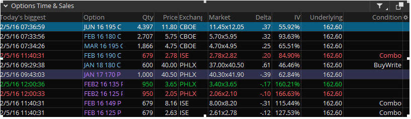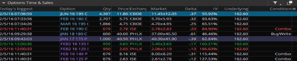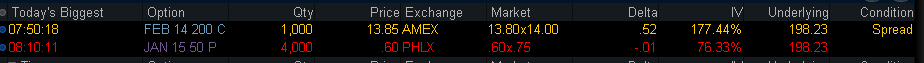 We need to look for clues in the Open Interest and volume of the options and today there was a 1,000 contract trade on the Feb 14 200 Calls. It appears to be a spread, but I do not see the other side of this trade. Using my gut feel and expert analysis, I am thinking this was a big bet they will beat and the stock takes off on Thursday. There was also a massive 4,000 contracts on the Jan 2015 50 Puts so you have to figure those were Naked Puts a hedge fund or whale of a trader is fishing for.