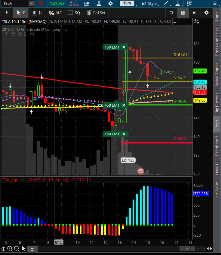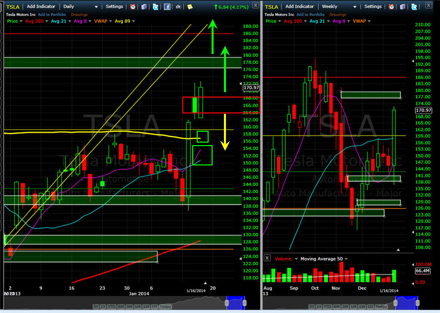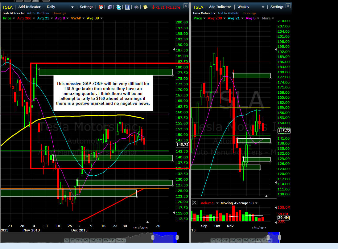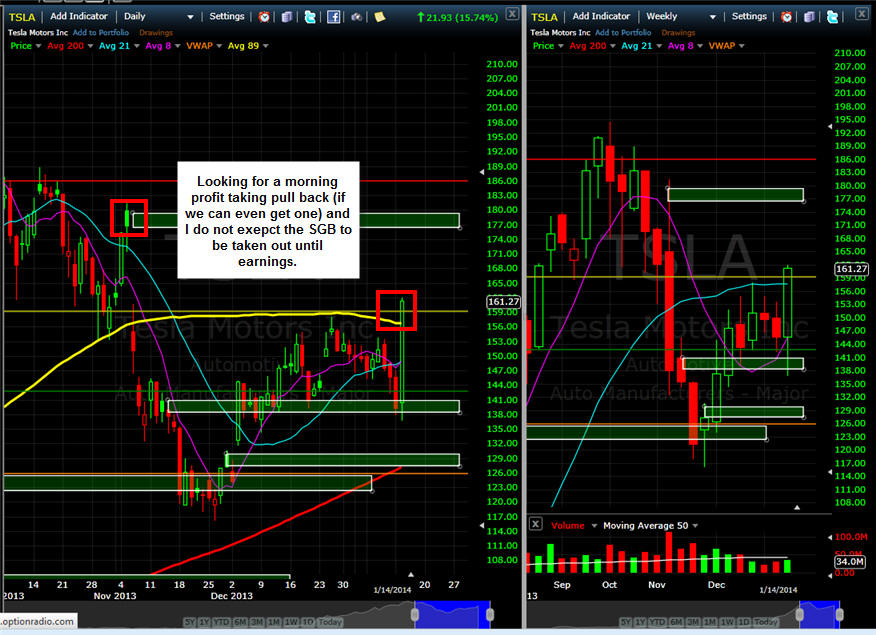 ========================================================================================================== 1/18/14 - Filled on all pending but the Jan Wk4 165 Calls at $5.50 - ================================================================================================================= 1/16/14 - Oops, had my dates crossed on TSLA earnings. They are not until Feb 17th. Still, we had a great week of trading but did not get the pull back I was hoping for. However, yesterday's trading resulted in a very big SGB, so we have our line in the sand—above stay long, below stop out or buy the dips on any bounce to the 89, 21, or 8 MA's.—this stock is going higher! I have no doubts that this stock will be very volatile all year so get ready for some MORE money making opportunities like we had this week. Just keep fishing for entry prices and start making some big gains going forward. I moved my strike up 1 but still fishing for a better entry point for next week.