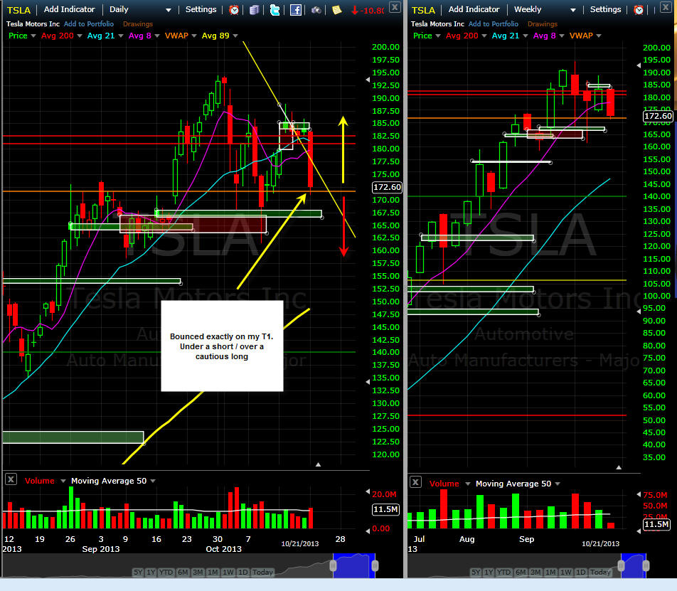 ============================================================================================================= 11/6/13 - Cha-Ching!! Nice day to be SHORT TSLA!!! Caught a WW trade this morning too! I still have some puts on and will be looking for some more opportunities to get shot if the stock can manage a decent bounce but the chart is massively damaged and TSLA was unable to close back over the 89ma on the daily so we may just keep on driving down to T3.