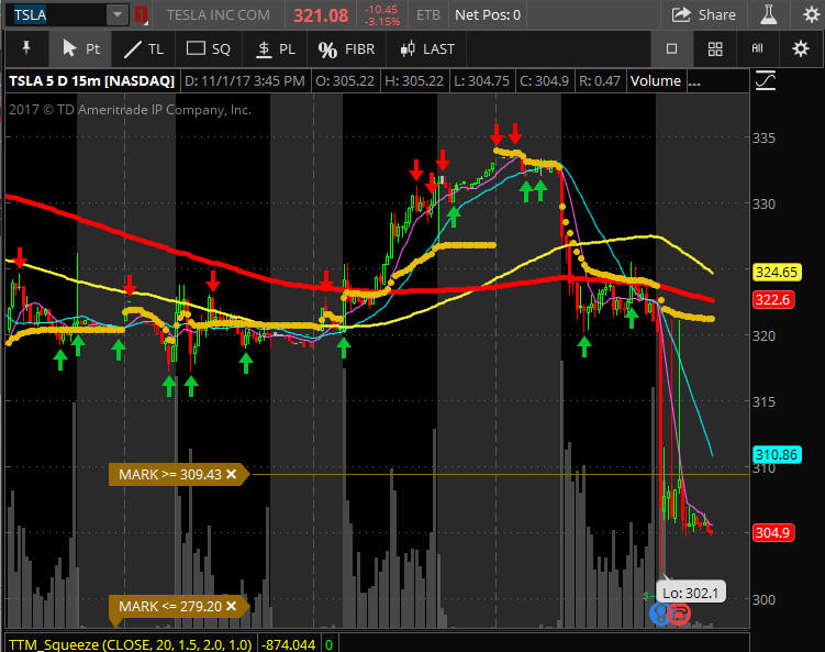 ========================================================================================================= 11/5/14: TSLA beats estimates, and stock takes off in post trading. Initially, the volatility was all over the place swinging around up to $20 at a times. If you were long in after hours, you had a heck of a time sticking to your position. I know, because I waited for the initial pull back and then jumped in only to have my patience tested with immediate draw downs over $1k on 200 shares before the stock finally found a footing and moved higher. Once the conference call started, Investors found confidence and kept on pushing the stock higher closing close the the after hours highs. Hopefully things will hold up tomorrow but the earnings report was not a total success. The company did lower guidance on the expected car deliveries of 35,000 and said they plan to deliver 33,000 cars due to constraints of hardware but demand is still there. Still, that is an impressive number and may entice investors to keep a vigilant candle of speculation going. We will see how the 280 Calls play out and this time, we have a little more time on our side. The Bull Put Spared will most likely need to be rolled out later in the month. I plan to do some WW fishing tomorrow and Friday. This stock can easily be considered way over valued and who could argue with that? I think the Cinderella story is turning the page with investors and the stock will most likely find its way back down to a reasonable multiple in the future. As that happens, TSLA will give us plenty of long term opportunities to make profits, so we just keep fishing around pivot points and SGB's going forward.