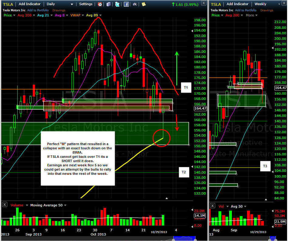 ==================================================================================================== 10/29/13 - Another model S fire and the stock gets crushed. When it found support at the 89 MA I cashed in my short plays today. With earnings coming next week, and this perfect technical bounce, we should see TSLA make a strong move higher this week if it can get back over $165. I fully expect T1 to be reached which is a full test of the M pattern as outlined below. If they miss earnings then this stock could be on its way back to a real valuation price level over the next couple of months. There are still tons of buy ratings and price targets of $200 plus. I put on another small put position at the close just in case today's 89MA bounce fails, but if TSLA makes it back over $165 and holds in the morning then I will buy some calls and sell some Bull Put spreads. I full expect some stock fireworks at earnings. The weekly chart is showing massive selling has been going on so in the long run, I think TSLA will definitely make us a lot of money on the short side if earnings are a bust.
