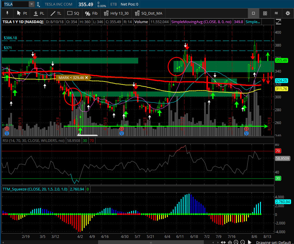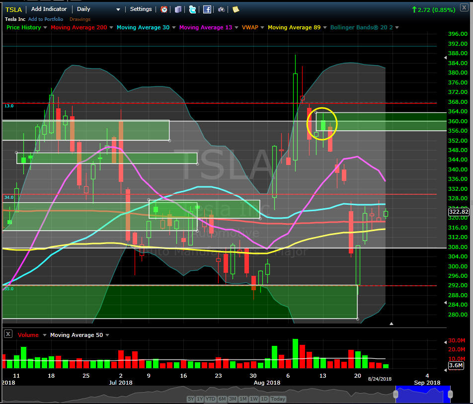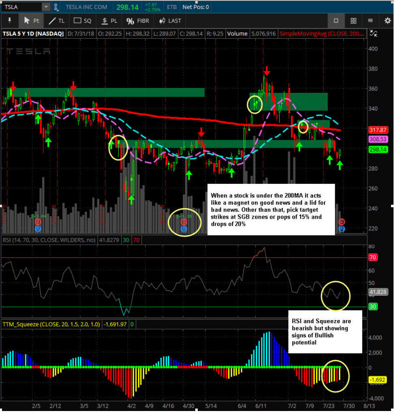 ====================================================================================================== 8/26/18 - The fix is in or the slam on the shorts is turning into a traffic jam for TSLA CEO Elon Musk. Over the weekend, he announced that the company will NOT go private and remain a public company. This is good news to shareholders as they are "believers" in this modern day Tony Stark and want to be able to cash in on the future as they roll out the Model 3 and beyond. There are a lot of reason to like and hate this stock, but the one thing you can't do is effectively short it. There will no doubt be some strong volatility this week, so if you plan on trading in the stock, the best (safest) way is to do spreads but you MUST shop for a better price. I am sure that Mr. Musk will have his legal hands full with class action lawsuits from disgruntled shorts, but really? If you short a stock, you full well know you are taking on big risk, so how can the shorts cry over spilled milk when stocks get news that jams them higher; and potentially beyond redemption when a buyout of a company comes? (e.g. LNKD...where were the lawsuits on that one by the shorts?)—whether a buyout happens or does not, I just do not see how these lawsuits will stand in the courts...caveat venditor!