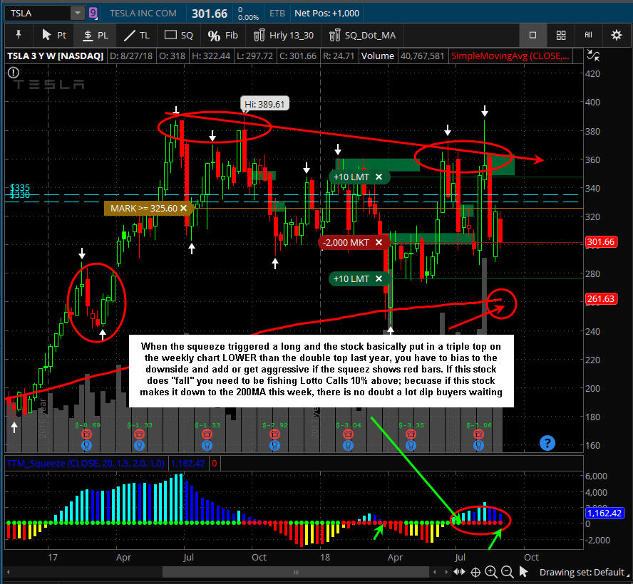 10/4/18 - TSLA sticks it to the shorts for a day and then the shorts stick it to the bulls the rest of the week. What a roller coaster this stock has been and a VERY difficult one to trade. Elon Musk is at it gain with his tweets (and rightly so in my opinion) mocking the SEC.