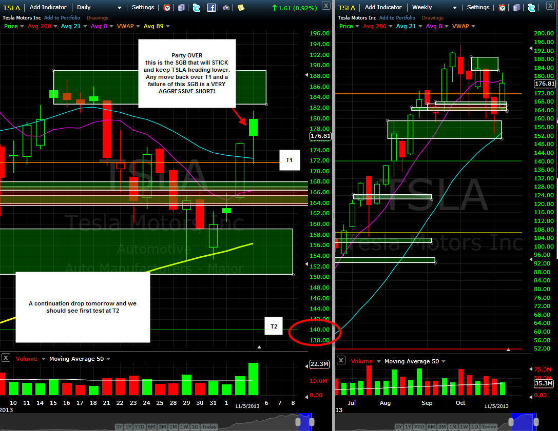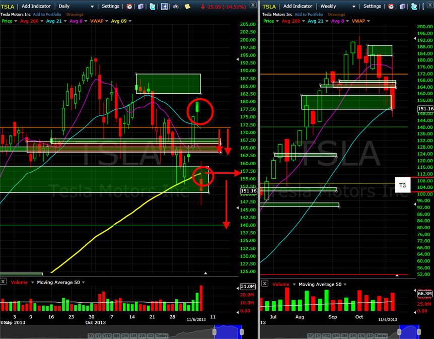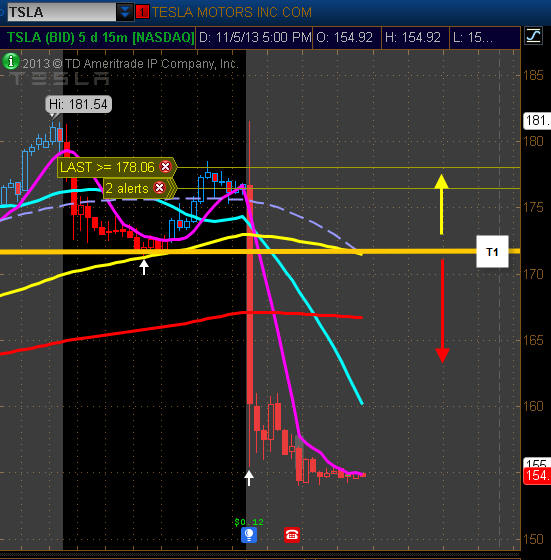 ================================================================================================== 11/5/13 - TSLA beats estimates but falls short on whisper numbers and unit distributions. Investors started a rally but quickly killed it and hit the sell button most of the after hours session. I could not get any shares to short so I missed out on some nice moves down. I attempted to scalp the long side but that was futile and cost me some coin. I have puts in place for the week and month, so if TSLA, which has crashed, burns, then I will be making some nice bucks to make up my losses on the call side. I am looking for a WW trade in the morning expecting this stock to pop and drop or drop and pop. The stock traded well below T1 and should see T2 easily if the selling accelerates this week. We will see if investors still have undying love for Musk and his ability to electrify them, but I think clearer heads are starting to catch on and this stock is ready for a sold return to a reasonable valuation around $100. There is technical support at $140 and there will no doubt be bargain shoppers looking to test the stocks resolve so be aware of that if you are shorting. If the stock does not rally tomorrow, I will sell some Bear Call Spreads.