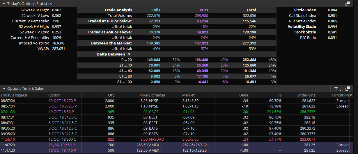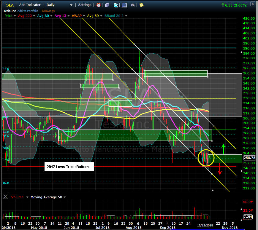 10/14/18 - TSLA appears to have found a triple bottom as the markets were taking a beating this week. Friday, the stock put in a SGB which gives us a nice pivot point to make trading decision; and with this weekends non-antagonistic tweets from CEO Musk could start a potential comeback if the markets hold ground too. The line in the sand for me will be the 200MA on the weekly chart, but any upside action I will view as very short-term opportunities as I am sure many big money investors are in a wait-n-see mode until the Model 3 sales figures roll out in 2019. Still, this is a "cult" stock and it sure loves to move around so when you are laying orders for Lotto Trades, but be sure to always put in lower offers to get better fills. What I plan to do is sell some ATM Bull Put spreads and buy some $295 CALLS.