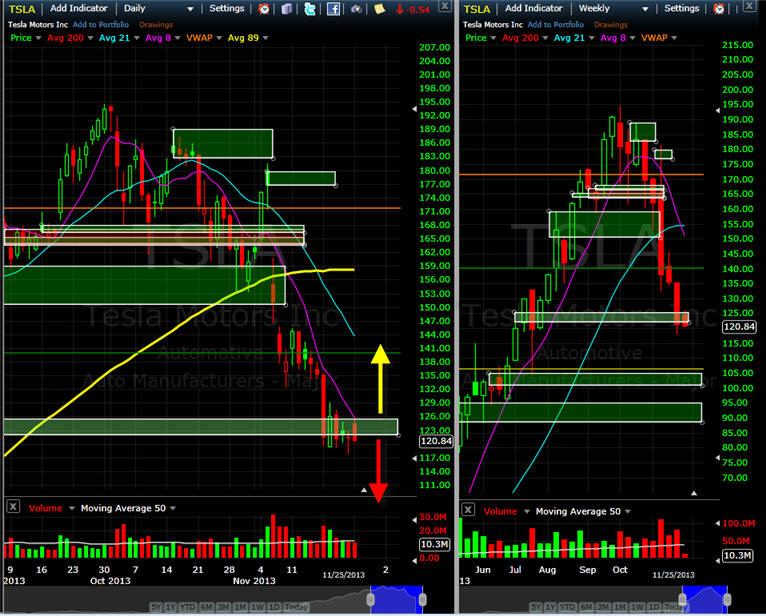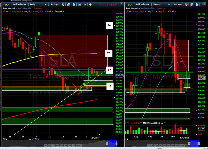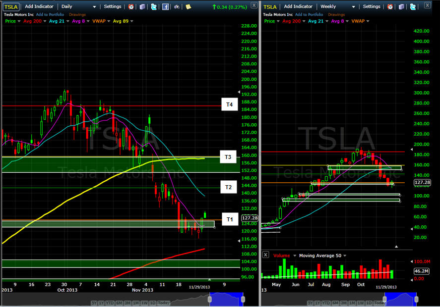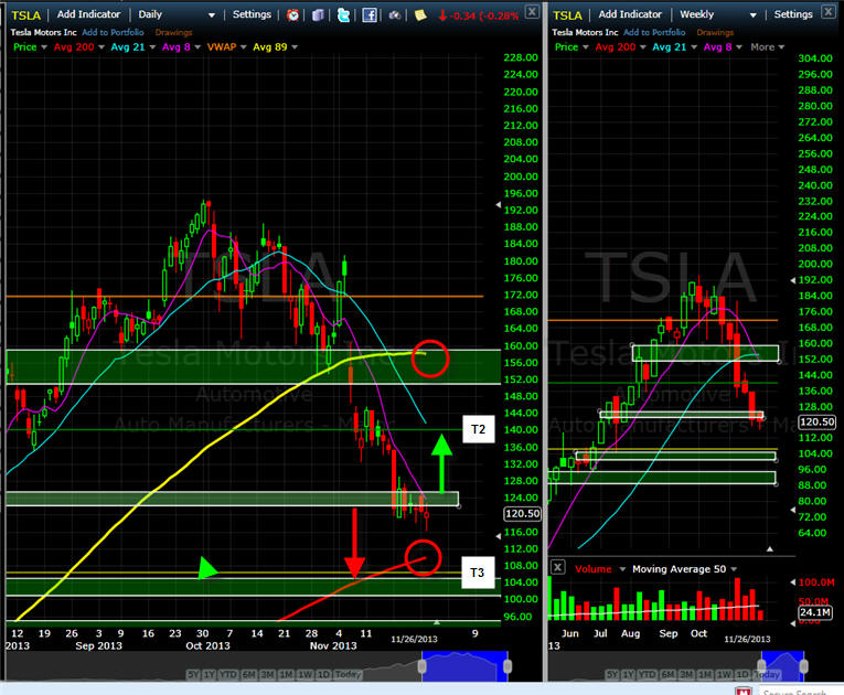 ========================================================================================================= 11/26/13 - So far TSLA is holding ground, but any move under $120 an I will look for a test of the 200MA on the daily chart. Any positive news and I expect shorts to cover rapidly so I will start nibbling on some 140 calls but I am still bearish until TSLA gets down to T3. I have not gotten filled on my puts yet so I am still fishing for a cheap entry point because if TSLA does get a short covering boost, then I do not want to take a huge hit.