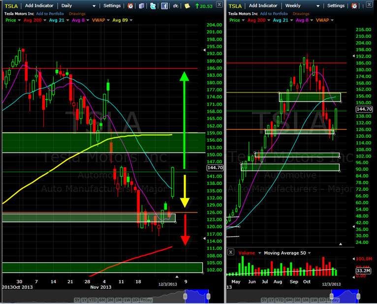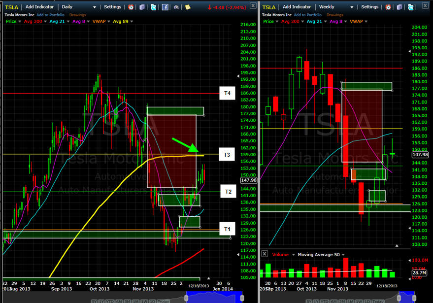 ========================================================================================================= 12/3/13 - Wow, what a HUGE day for TSLA! Shorts were covering all day as the news broke that Germans clear the Model S in fires. Looks like the love affair has been rekindled. Other related news was the launch of a rocket from Elon Musk's SpaceX company. With today's big move, I expect there to be some more even if the stock pulls back with the markets because investors will be looking for companies to put money into and TSLA just has way too much "future" going for it so people just want to get in the next rocket ride! I jumped all over some calls this morning when I saw the price action at the open and what a nice day if you were already fishing based on my comments below. The stock took out my T2 price level and the next milestone will be the 89MA on the daily chart at $159.00. If this momentum hold T2, then I expect TSLA to reach T4 over the next month or two. There will be a battle at the next SGB zone for sure, but I do think this stock will eventually reach $200+ a share if there are no more car fires and/or negative news releases. If we get any dip tomorrow that holds a 55% retracement of today's range, then I plan on selling some Dec 13 140 Bull Put Spreads and buying some more Dec 145 calls.