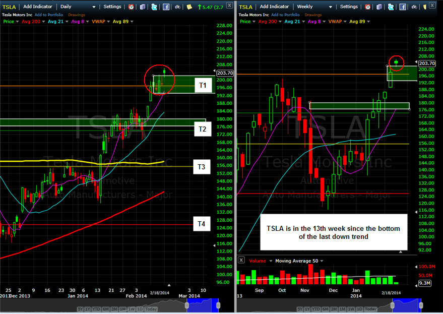 ==================================================================================================================== 2/23/14 - TSLA earnings were excellent and the stock made an impressive gap higher, but this one resulted in a third SGB short signal; and on Friday, traders began taking some profits. If TSLA opens lower on Monday and /or fails the high of the post earnings SGB, I will start doing some bearish short term strategies. For now, this stock is running strong on all cylinders, so any dips will be viewed as buying opportunities; therefore, we cannot get married to any successful short strategies—that means TAKE PROFITS at the 20% level or if you get bigger ones, make sure you put in profit stops at 20% or higher—pigs get fat, hogs get slaughtered! TSLA has completed 13 weeks of trading since the last multi-week downturn, so I am looking for a test of $200 if the SGB proves to be the short signal, and if we get below that, I fully expect heavy bargain hunters at T2 or the 21MA. So, if you take on short strategies, then be sure to lock up any profits if you have them; otherwise, your strategy should be to fish for long entry points as TSLA pulls back on potential continued profit taking. The Mar 250 calls were filled so I am in for the duration on these and will add if TSLA moves back over last Thursdays SGB high on a closing basis. Remember to always FISH for a better entry price because the call options will be pumped up with plenty IV.