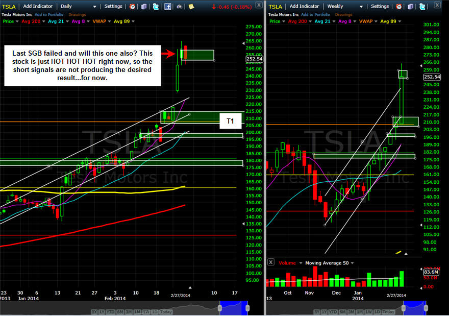 =========================================================================================================== 3/2/14 - The SGB short signal proved to be an accurate signal once again on TSLA. The last one produced only one down day and now we have two. I will be watching how the markets move tomorrow, and if TSLA does rally, I will be looking for a test of the SGB high. On the downside, fully expect buyers to step in on any weakness so I am not going to aggresively short this stock.