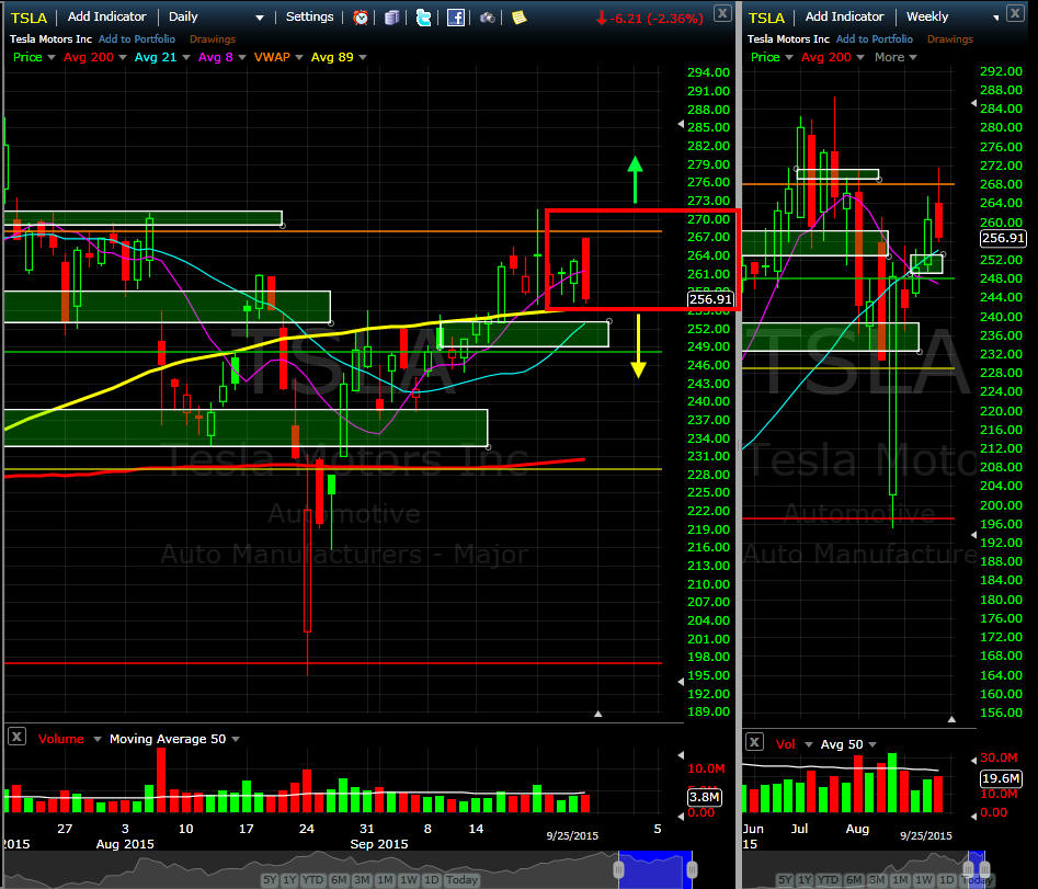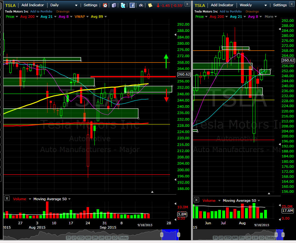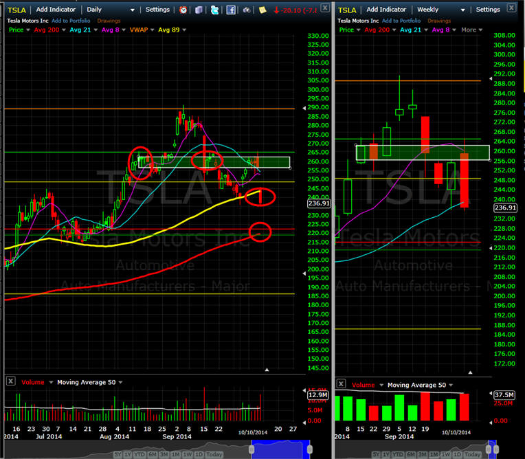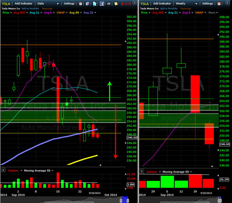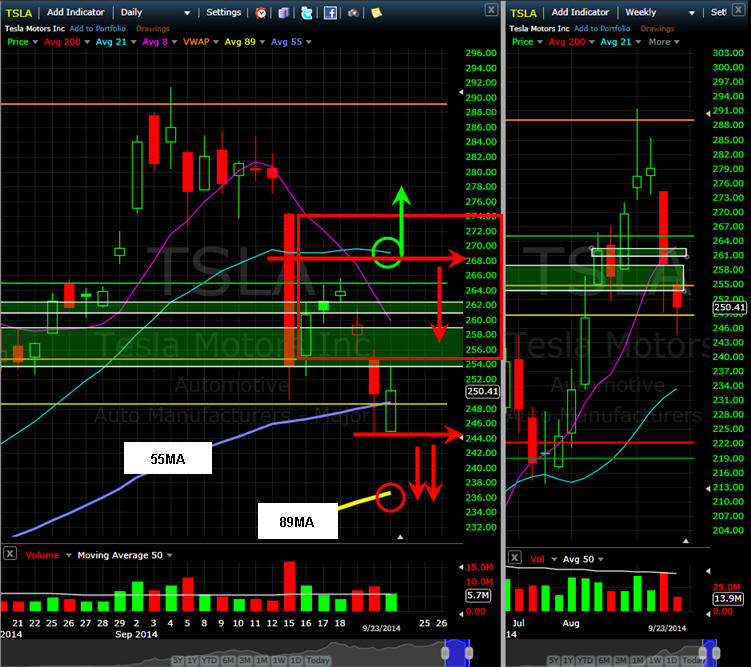 ============================================================================================================= 9/23/14: Nice gap down on Monday that was tested today so this gives us the perfect short entry point. If TSLA fails the 55 MA and heads back under it then I will get more shorts on with an initial target at the 89MA. If the recent selling in the markets continue, TSLA is going down. With that huge Bear elephant bar on the daily, any rallies are short opportunities until TSLA takes it out. I have been fishing for a rebound to get a short play on, but I needed TSLA to rebound higher to get my price on the 250's so I am still going to fish; however, if TSLA make a break lower, then I will jump on a couple puts under the 55MA.