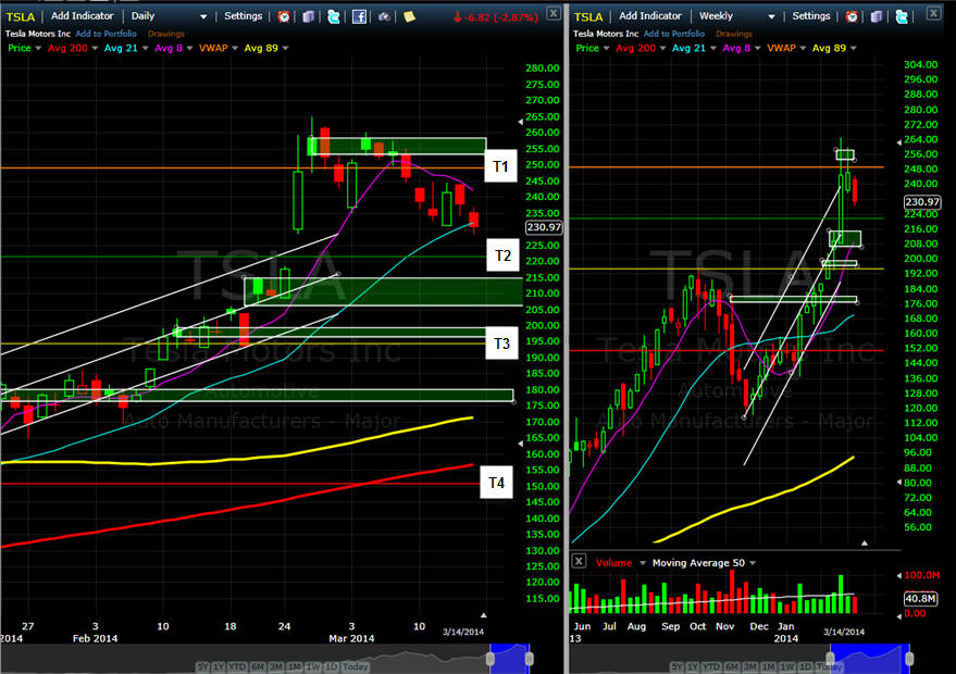 ======================================================================================================== 3/16/14 - The SGB's strike again! Now that TSLA has begun to pull back, it managed to barely hold onto the last earnings gap, so if that fails, I fully expect this stock to test the next SGB down at T2 or as low as $200.00 - $215.00. Now if we get a market rally this week, TSLA is a favorite to find upside action if this current gap holds so I am looking for some calls on a test of T2 and puts on a failure of the gap support.