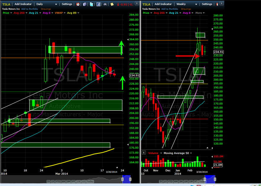==================================================================================================== 3/23/14 - This week will be pivotal for TSLA as we closed at the bottom of the gap range. I was filled on my swing trade on the 235 Calls and if the stock give this gap up tomorrow morning, I am looking for a test of the SGB and will have fishing orders in place on the $225 calls. If TSLA holds ground here and heads higher, I will sell some Bull Put Spreads.