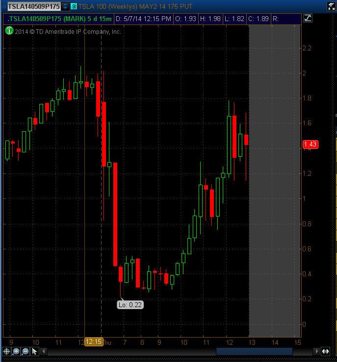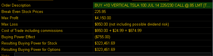 ======================================================================================== 7/14/14: TSLA is back in the news again and the stock is on the move. I am looking for a pull back so I can get a Bull Put Spread on.
