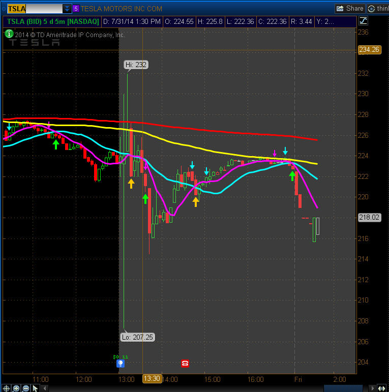 ============================================================================================== 1/14/14 - Wow the shorts were SQUEEZED HARD today off news stories and the beginnings of the electric car wars. With earnings on Friday, there could be a HUGE opportunity, especially if they miss! I am fishing for a pull back tomorrow and I will buy some puts too now that they are dirt cheap. If you jumped on some calls from my last comments, then you are VERY happy today! I hope you took some profits off the table if you did. Too bad earnings are not on Thursday so we could have a WW trade, but there will still be plenty of profits to made next week.