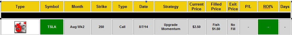 ==================================================================================================================== 8/10/14: No fills on the 250 calls so I cancelled the trade. I was filled on the Bull Put Spread and with Friday's sharp pull back, not so confident TSLA will make a move back over $255 this week. As I suspected, that "upgrade" was a sucker punch and TSLA was met will strong selling (profit taking) on Friday. I am looking for a pull back down to the 8MA on the daily chart before I get in on some long plays again, but if the stock does make a play for higher ground this week, then I will put on some more Bullish spreads.
