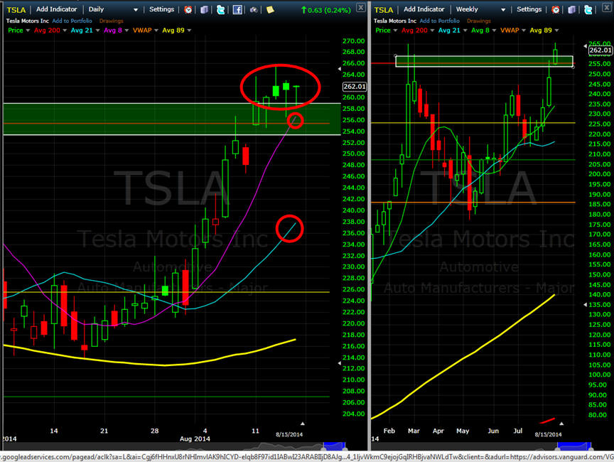 ====================================================================================================================== 8/27/14: Every news story about Musk lifts TSLA higher and higher weather its good, bad or indifferent! The stock has now powered through the SGB's yesterday, so a continued close above is a long and below is a short. Big upside price target and upgrades will have investors chomping at the bit to buy any and all dips so be careful on shorts. Better to just sell premium spreads with defined risk and speculate with OTM Lotto calls and puts. I moved up my Sep put strike and will continue to fish for lower entry points. You have to let TSLA come to you vs. jumping in because the Market Makers will gladly TAKE your money.