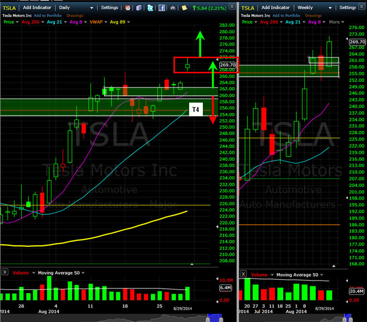 =============================================================================================================================== 8/12/14: Looking like higher prices are on deck now that TSLA moved back over T4 and the SGB zone. With today's rally off T4 this afternoon, I was forced to cover my puts and now it appears the stock will be heading higher tomorrow. There is the last SGB zone back at the previous all time highs that proved to be the top, so we have to consider it could be that way again; however, there have been upgrades and price targets to $360 plus they did beat earnings by a wide margin too. In addition to that, there was some harsh reviews from Consumer Reports about mechanical problems, manufacturing defects etc. and that could not bring the stock down as investors shrugged it off and the shorts (me being one of them) were forced to cover. Now that could be considered very bullish; and with August expiration in two more days, we should see some volatility for sure. I plan on buying some calls over $265 and if the stock fails the SGB zone I will will get aggressive on puts.