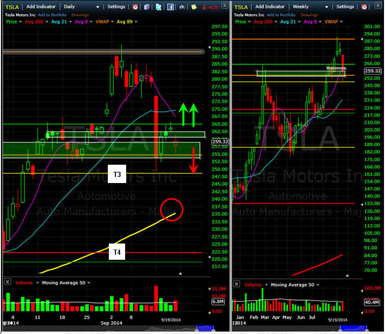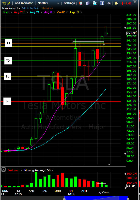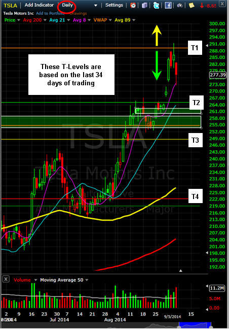 ====================================================================================================================== 9/7/14: What goes up must come down, but by the comments of the companies own CEO? Once again, Elon Musk makes comments that he thinks the stocks price is way too high if you are a shot term trader, but a value if you are a long term trader. The last time he made comments like that on CNBC back on Aug 22, 2013, the stock actually when higher! This time, the news gave me a very good day trade with puts; and I am just itching to get into some more bearish plays on any rebound that does not take out $290! If we do not get a rebound on Monday, then the most likely drop will be the last SGB's around $260.00. I plan to try a butterfly spread on the $260 strike. I am sure investors will view this as an opportunity to get in at a discount, so watch or try entries around the 89MA or T3 if the stock really starts to take a turn for the worse. Looking over the charts for T-Levels I have calculated them based on the Daily chart first and then the monthly chart.