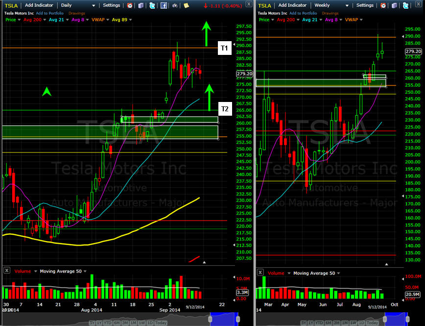 =================================================================================================== 9/13/14: Still fishing for my next entry point as I manage my current positions. TSLA has been consolidating for the past two weeks and the pattern is a classic Flag/Pennant which is typically bullish, so any positive news and up we go but I am hoping for a dip so I can get my fishing trades filled. If the stock makes a move over $282.50 then I will jump in and adjust my some of my Bull Put Spread entry points. If you want to fish for an upside surprise Lotto trade, then go with the $297.50 strike because this stick will make a move for $300 once my T1 line is taken out. If the stock moves lower on Monday, then I will lower my strike at the same move the stock makes.