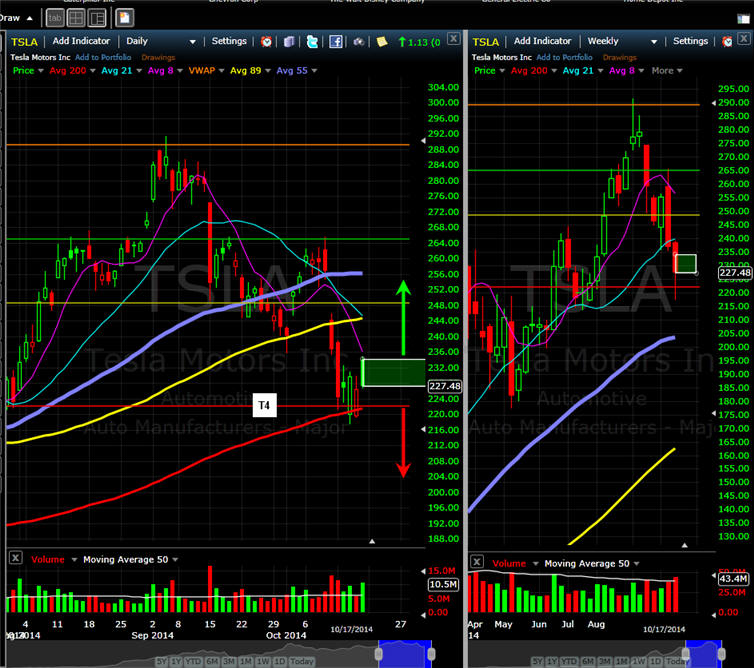 ====================================================================================================================== 10/19/14: With earnings not coming until 11/4/14, TSLA is vulnerable to the SGB short signal, but with the 200MA and T4 being tested, it may be a short lived drop. The likely target if this happens would be at the 55MA on the weekly chart around $205.00. If you want to speculate this SGB will produce a short, then buy the Oct4 220 puts to assure you have the best probability of being ITM if that price target hits.