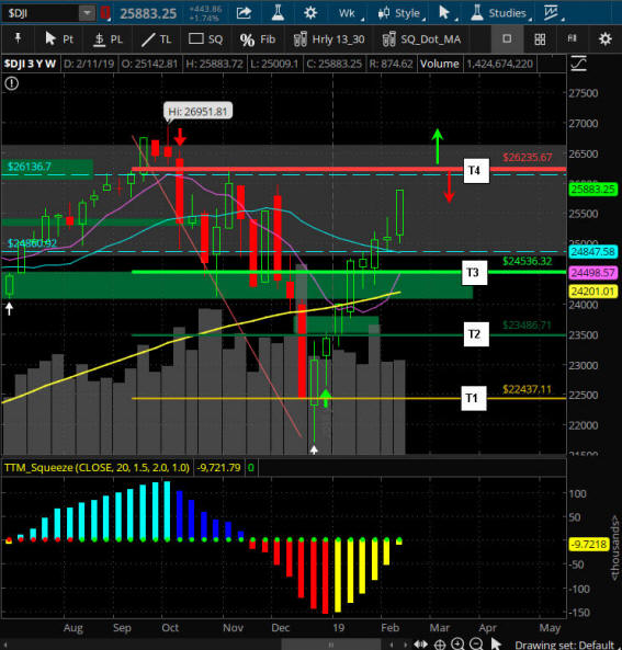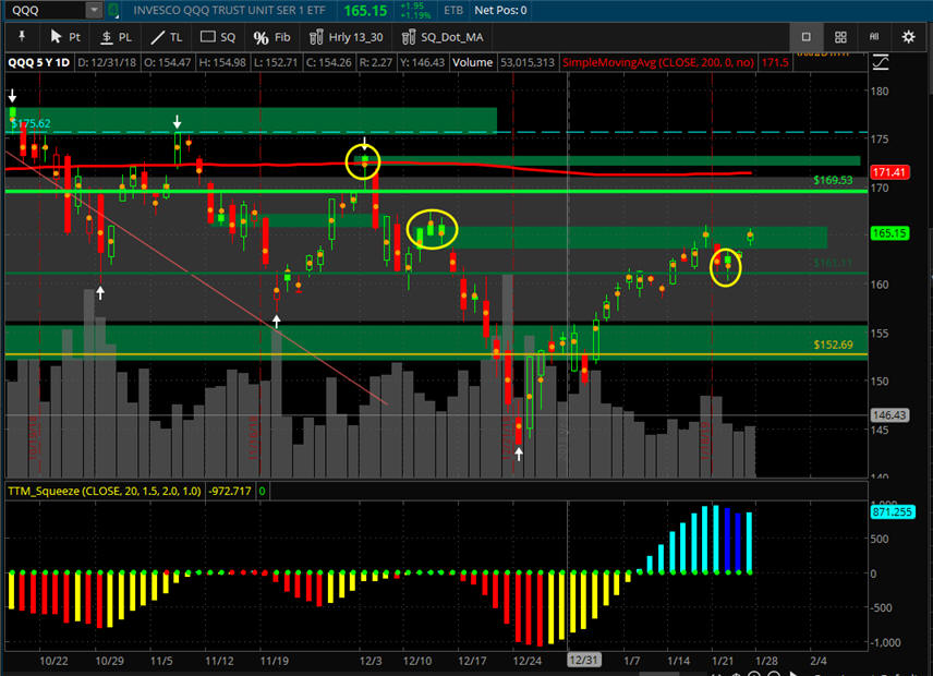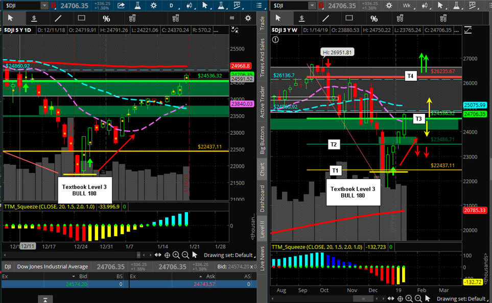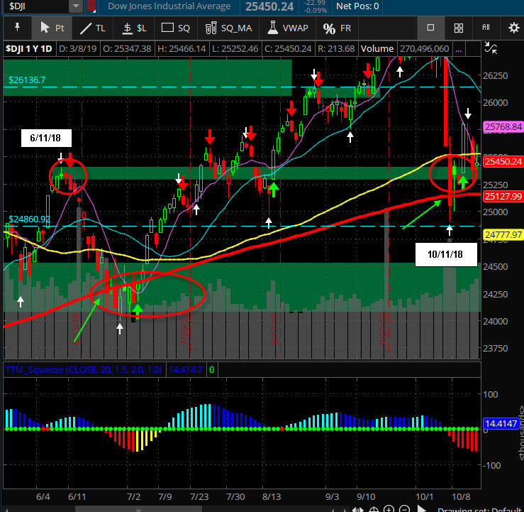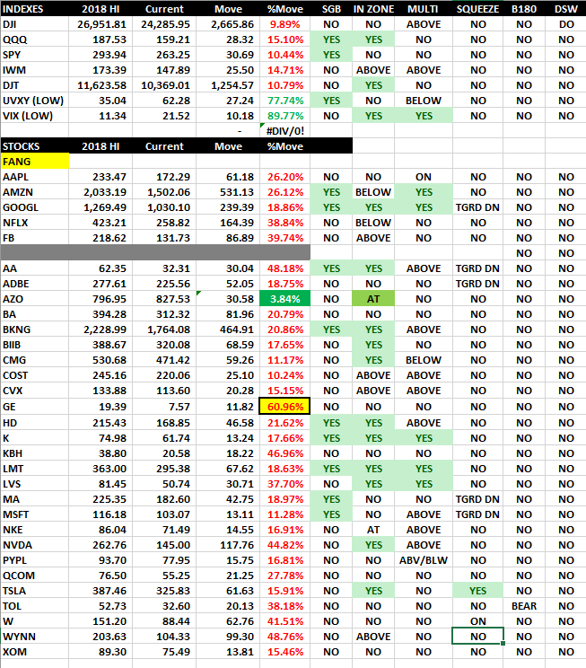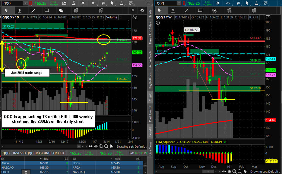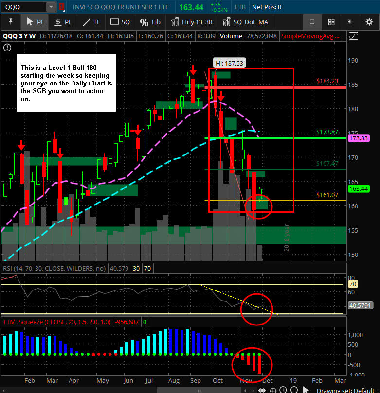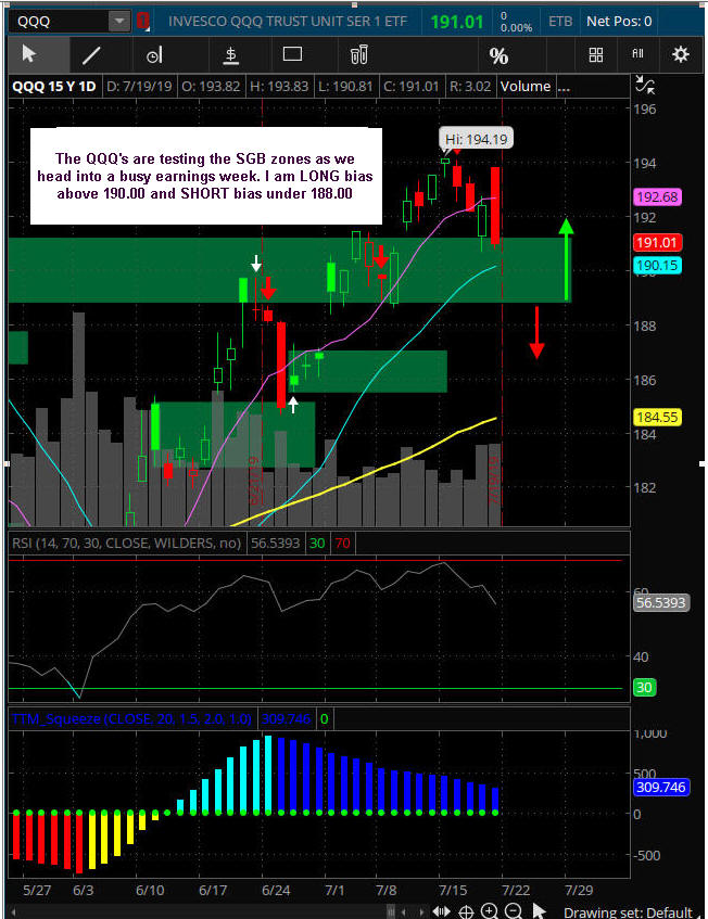 The $DJI is "LOOKING" like higher prices to come; however, Friday was a SGB at T-3 on the Bull 180, so if the China news over the weekend has any impact, we are looking at a re-test of the 200 MA; otherwise, the technical squeeze indicator is pointing to a move UP and if earnings are strong, we get a move back to the all-time-highs by years end once the SGB zone is taken out. Either way, we should see some really good Lotto Trade opportunities, so I am continually putting in fishing for PUTS under SGB's and CALLS above them on indexes and stocks.