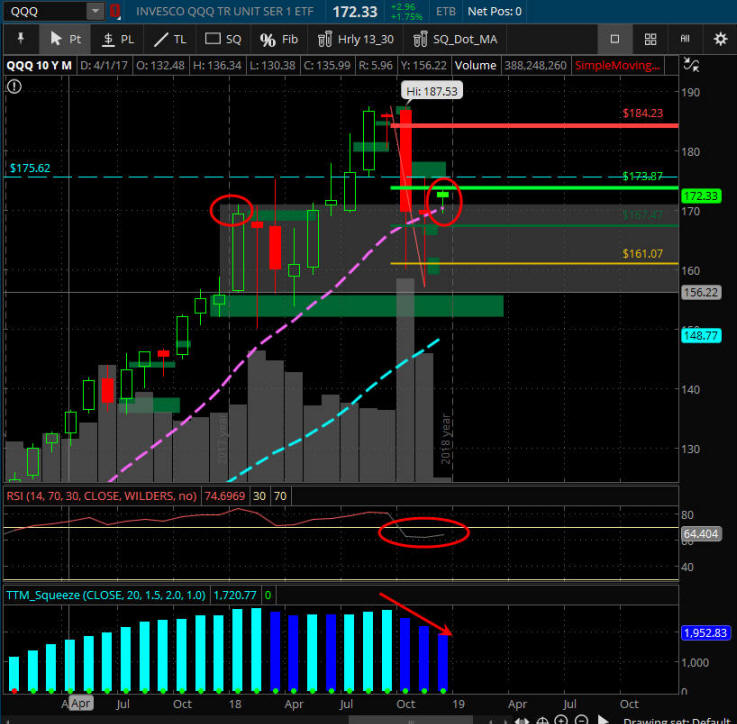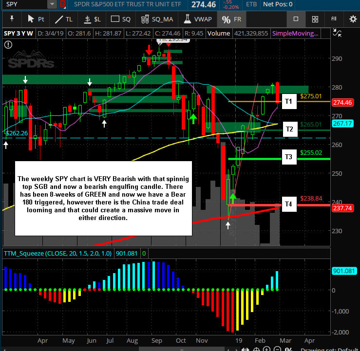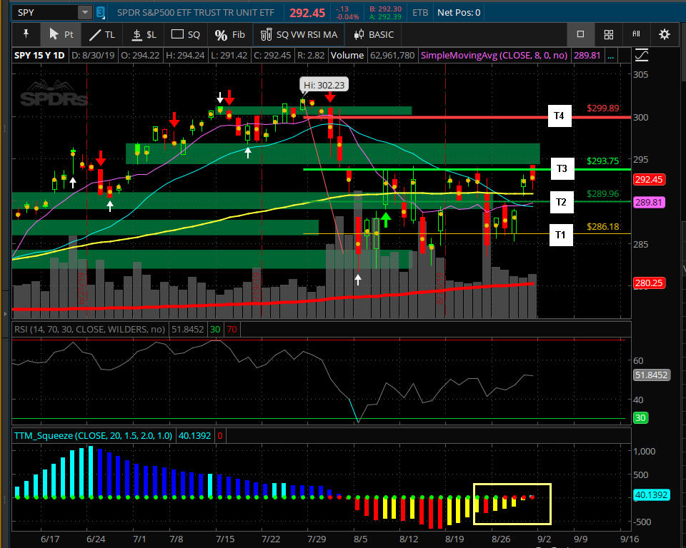 The SPY charts is looking ready for a DROP since it failed to take out the SGB zone at the Bull 180 T-3 line; however, the SQUEEZE indicator is showing a HIGHER move is about to be released. This will take some positive China news along with some solid earnings reports in October, so for now, my bias is to PUTS until the SPY can et over 296.