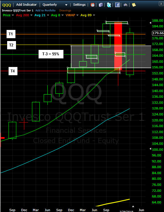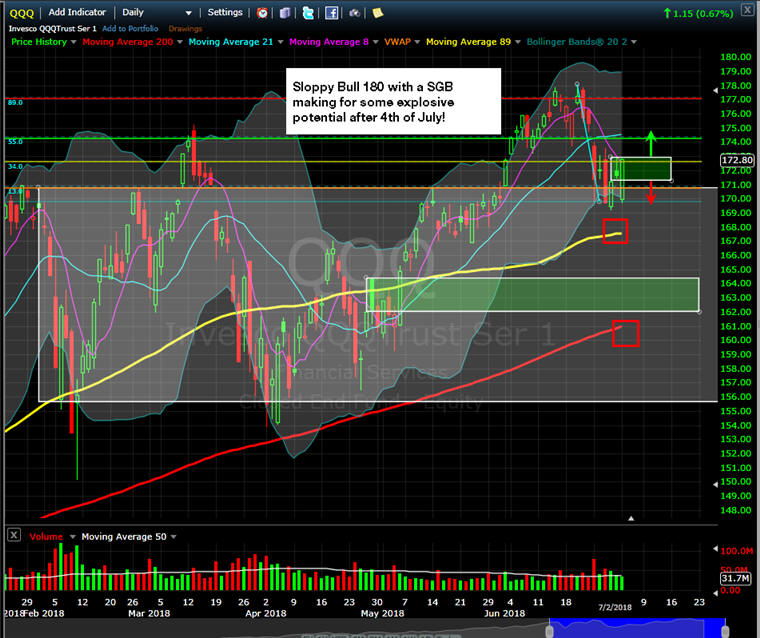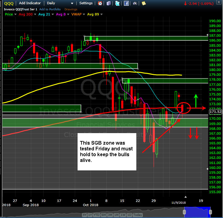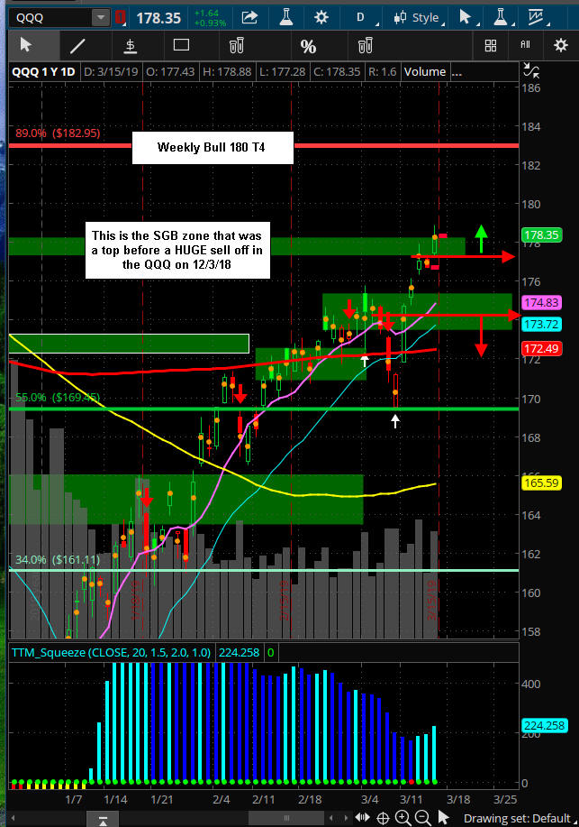 The SPY failed to hold the SGB zone and down it went blasting through the lower SGB zone with strong volume. Now it has become a Level 2 Bull 180 setup and we are going to see if this market can get back on track and resume a trend...up or down is fine with me...I just want to see that trend happen.