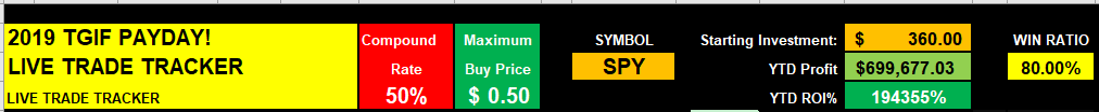 When I developed this strategy back in April, I only had the benefit of hind sight statistics to apply the formula to; and if you look at the chart below, the SPY was on a solid upward trend until MAY and now it has been in a very volatile trend. Needless to say, this strategy is going to have some difficulty in current market conditions, but you can rest assured an up or down trend will develop in the future (probably after Jan 2020); and when that happens, we will achieve 7-Figures in less than 12 months!