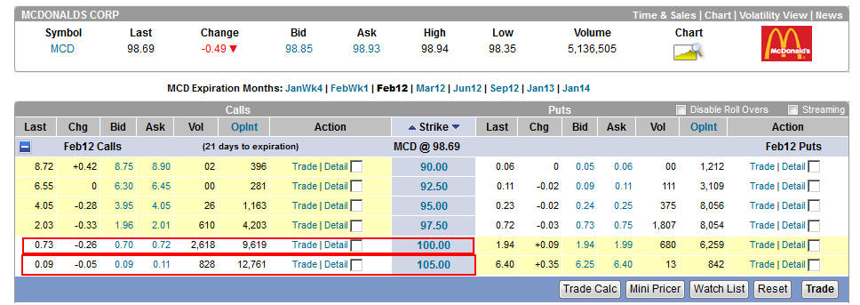 I will set up to trade 500 shares and sell the Feb 100 Calls Naked to collect premium to buy the Feb 105 Calls for insurance. Since they are so cheap, I will actually be able to purchase 30 contracts so if MCD decided to head higher, I will make a huge profit on my insurance policy!