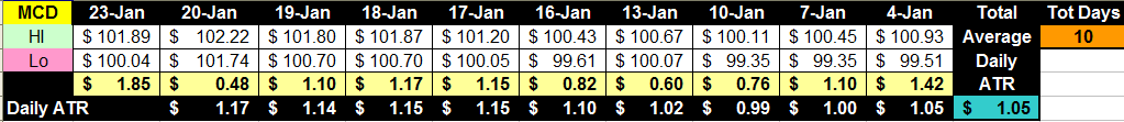Next we look at the ATR of MCD for the past 10 trading days to get a baseline of expected movement each day: