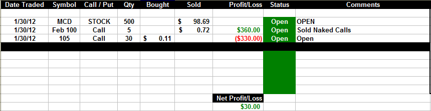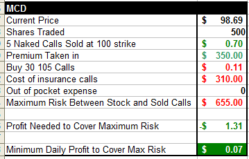 Our stop will be placed at $103-$105  because we will need the capital in our accounts to meet any broker requirement to take delivery of the stock should MCD stay above $100 per share before Feb expiration.