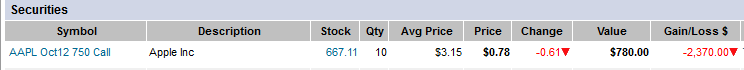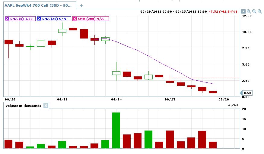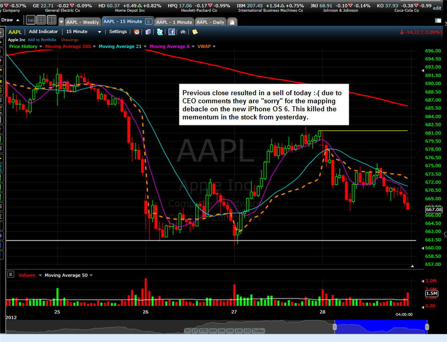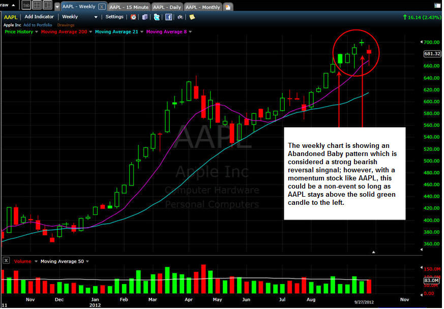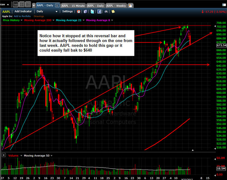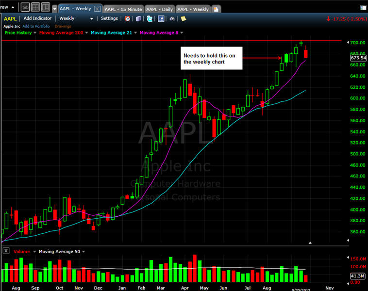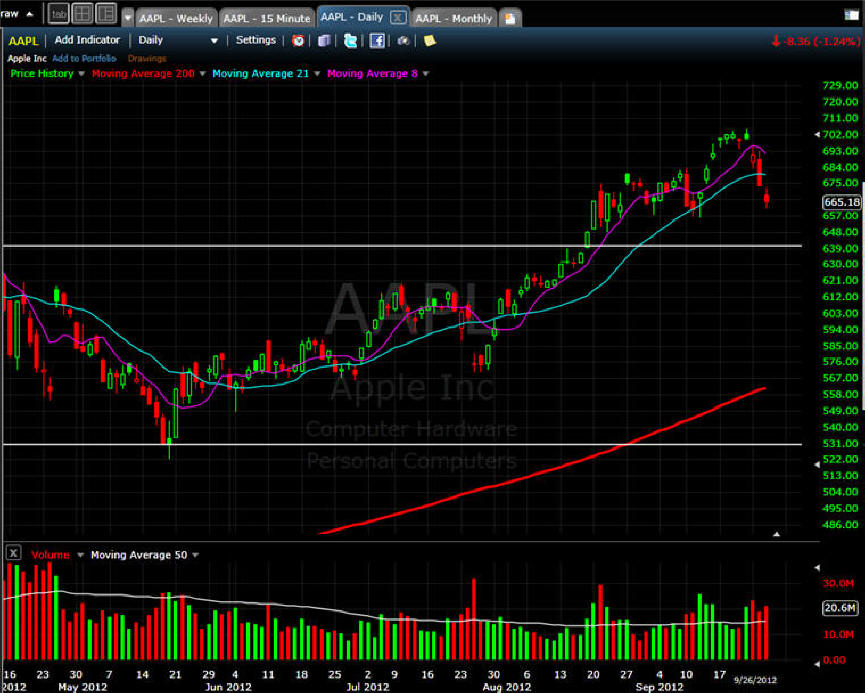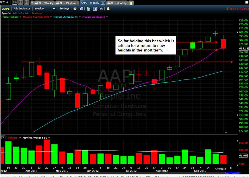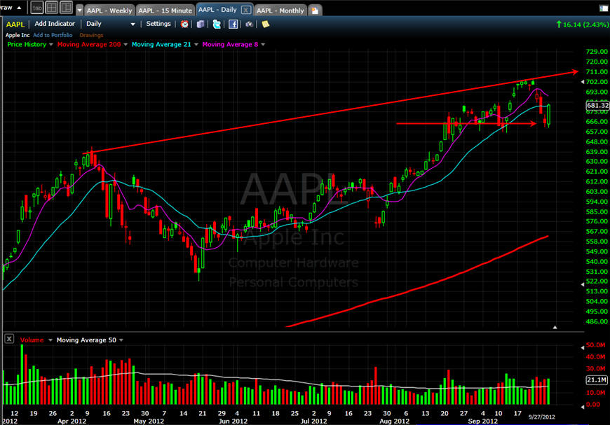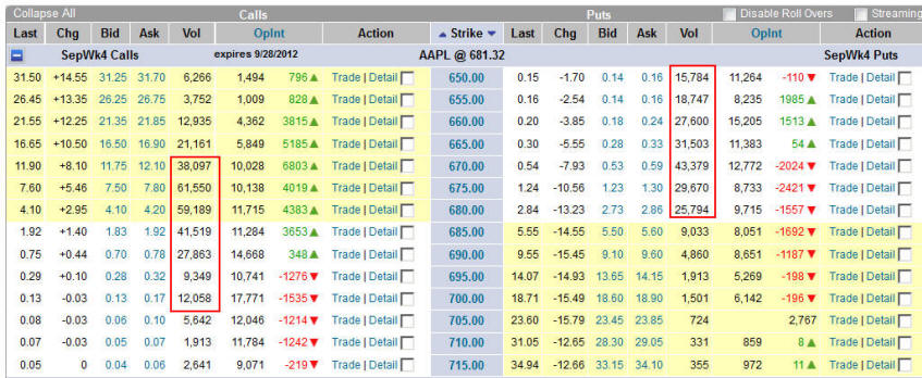 ========================================================================================= 9/26/12 - Tomorrow is going to be proving ground for AAPL. $666 has been an interesting holding point for this stock and should it be the final pivot point, AAPL could definitely make a run back to $700. At least that is what I am hoping for...and so are millions of other investors, but are the big time fund managers seeing it that way is the real question. After all, they are the muscle to move a stock around and looking at the last three days of selling, it appears they may have taken the rest of the month off. This is the end of quarter and there will no doubt be portfolio shuffling going on here, so if you were a multi-million or billion dollar fund manager, would you be dumping AAPL or adding more as it pulls back?. The best way I can find clues is looking over the option open interest and then the big elephant bars on the charts when a stock makes a move. Now looking over the October options I see a massive amount of open interest at the $700 strike. If you recall from the last few Apple commentaries, the Sept. 700 had a a ton of volume too, but this time October has a whole lot more! —This indicates there will be a lot of resistance at $700 heading into earnings next month. Now for the flip side, the puts are heavy on the $660 But look at the 600's...wow, they have just as many? Is that a misprint? This is more likely Naked Put selling which indicates even more potential for a continued rally to new heights. Ok, so now we look at the weekly options and again there is massive volume at the $700 strike. plus very heaving speculation at the $705-$715. So, if you want to take a little lotto trade gamble, be sure to buy no further out than the $700 and hope for a dip in the morning so you can buy the $690, that way, if AAPL does make a run for the money, we stand a much better chance of winding up in-the-money on Friday. If AAPL does sell off tomorrow, then try to buy even the $680's.