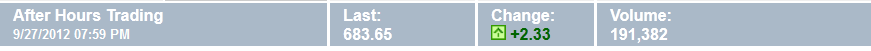 ======================================================================================== 9/27/12 - Off to the races! Looking good for a continuation rally back to $700. I hope it gets there tomorrow so my Lotto Plays make a huge profit! I scalped and locked in a profit on the SepWk4 680 calls today, then I bought into the $690's for tomorrow.