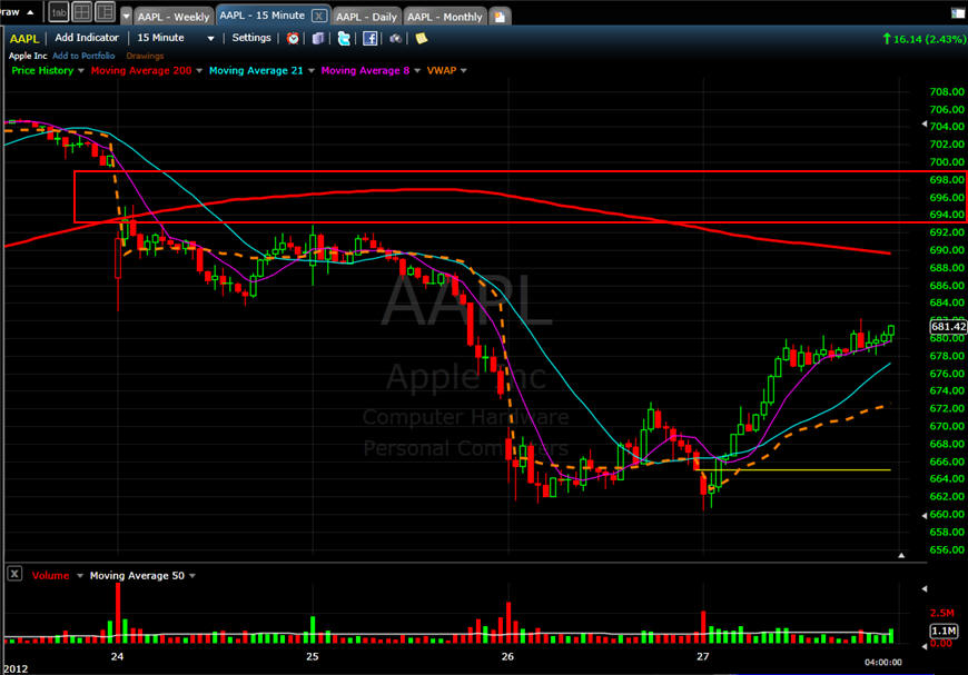 It's looking like the bias is definitely long going into tomorrow, so if AAPL gets a strong gap up in the morning, you should take the profit because there will be a lot of resistance at $700.