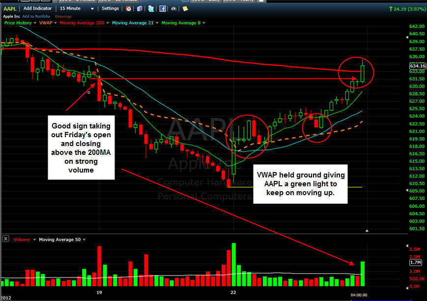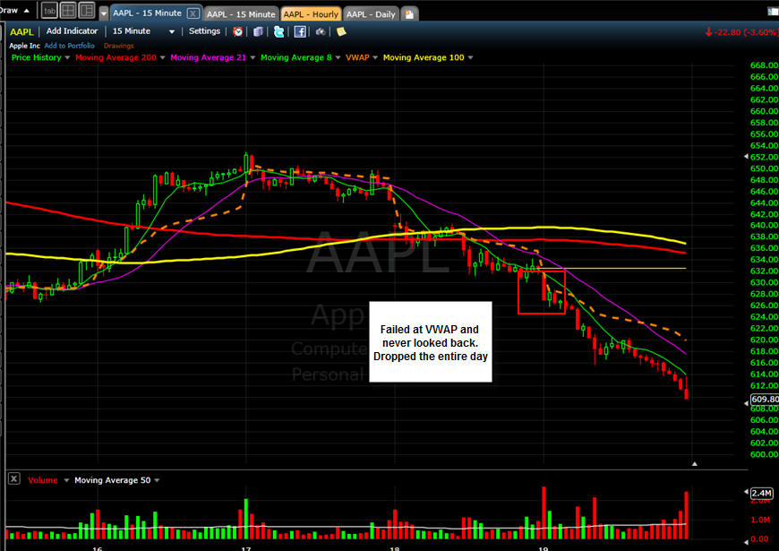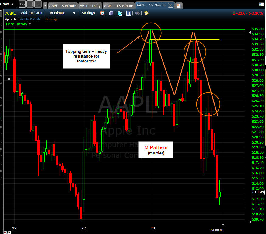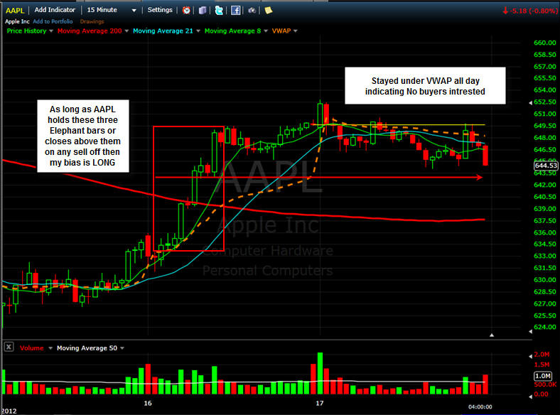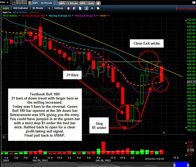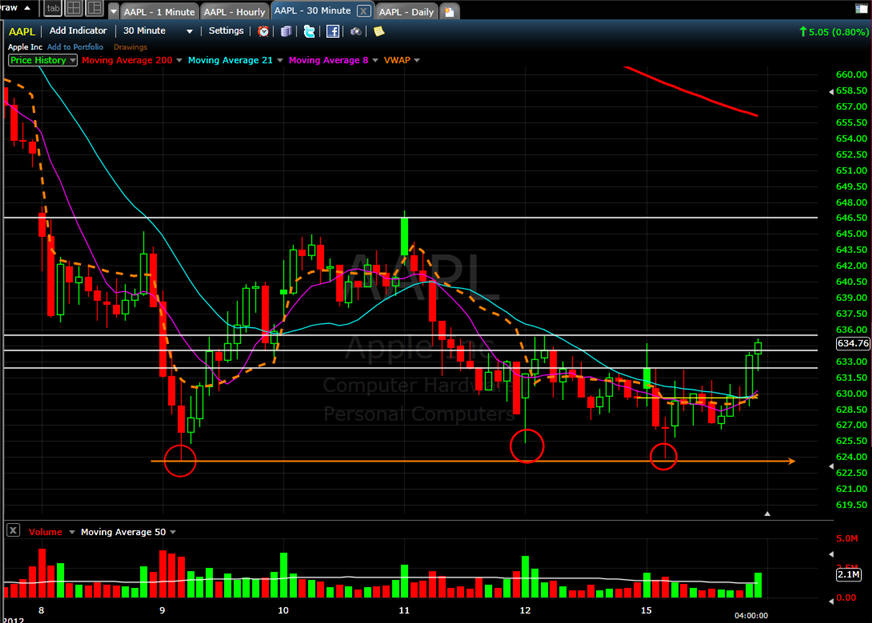 ============================================================================================ 10/15/12 - So far, $623.55 is holding it's ground as a my suspected bottom signal. AAPL bounced all around VWAP today, but started the day off up only to be sold off most of the day. I did a lot of trades today looking for a real bias and it appears up from here may be the direction heading into the rest of the trading week. So long as $623.55 holds, I will stay long. Notice how the stock closed today at $634.76? 34 is a Fibonacci number! I know, I may be trying to make something out of it, but I just watch close with a stock closes or pivots and a Fib number is involved.
