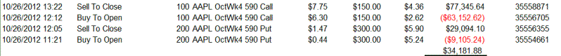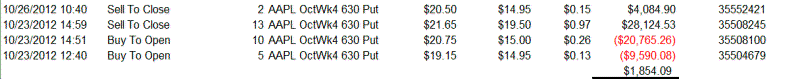 =============================================================================================== 10/17/12 - No follow through today, but I am sure that is due more to profit taking and GOOG earnings tomorrow. All the buyers went to GOOG and bid up the price while AAPL pulled back. If GOOG blows out, then AAPL should rise with it as investors anticipate the same will happen for AAPL next week. With the news conference coming, there could be some wait-and-see over the next couple of days. I am hopping that GOOG and CMG both pay off so I can roll up those profits into the AAPL play and finish out October with a Halloween treat bag full of cash!!—no tricks allowed!