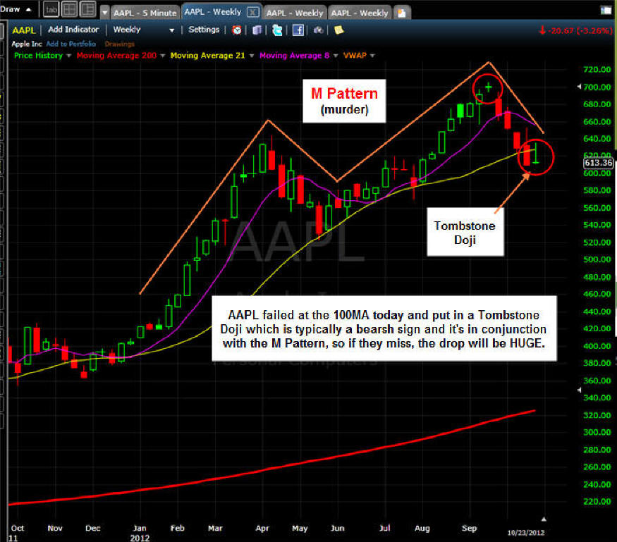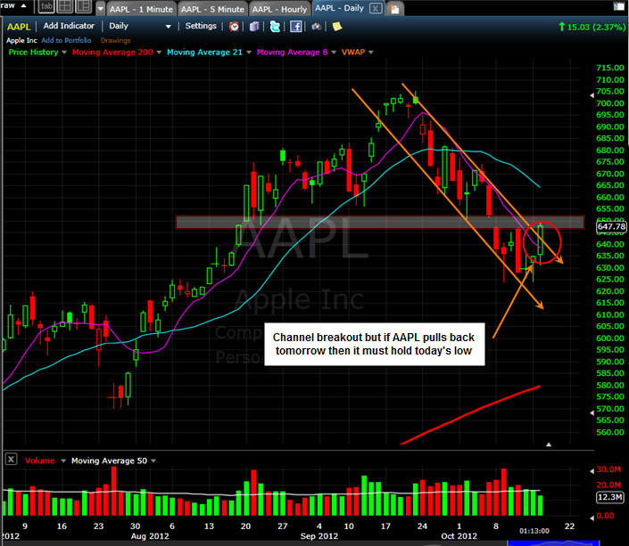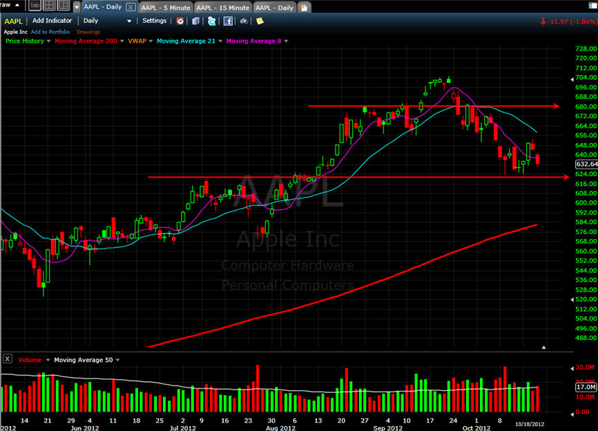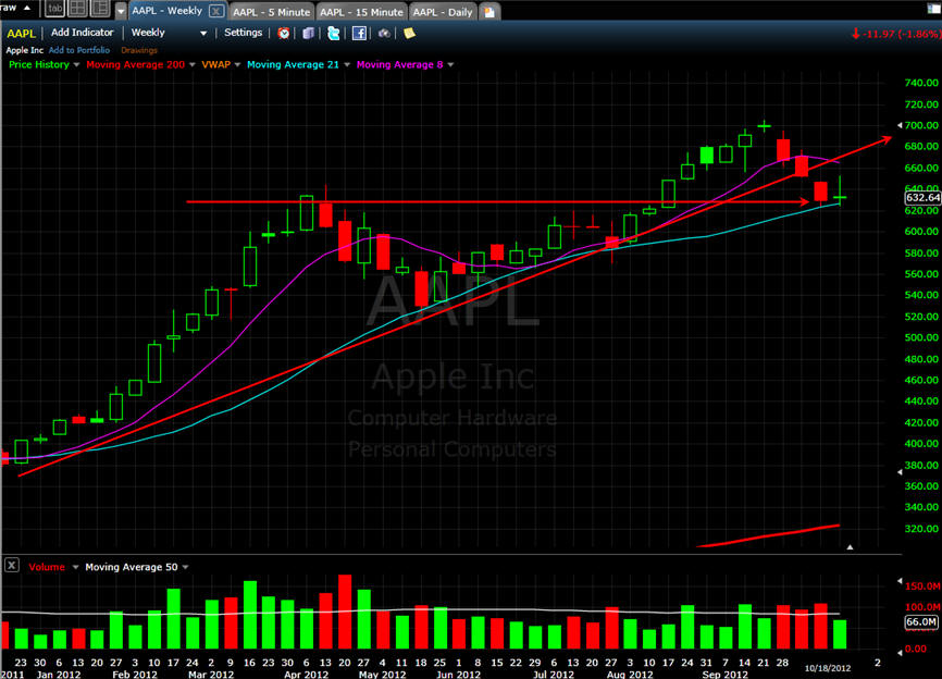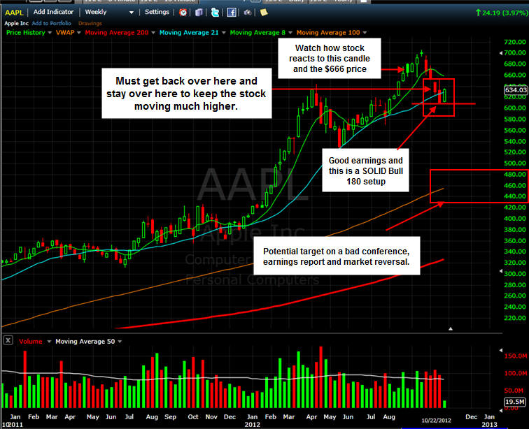 The donFranko ============================================================================================== 10/22/12 - Ok the markets polished up the AAPL and hope to be taking it to school for an October treat. Let's hope the earnings release will be a blowout so we do not get schooled for getting long this stock. As always on a stock like this you have to straddle it and based on the results with earnings so far, I prefer to overweight puts but with AAPL anything can and will happen. Plus, with all the selling pressure it has suffered the past couple of weeks, I think all the sellers are potentially cleared out. What concerns me a little bit is the result of the daily chart. I was day trading AAPL today because the market makers are committing criminal robbery on the options premiums if you ask me. The risk reward is just to high for me to play the options until Thursday. I am pretty confident there won't be a disaster early release like we had with GOOG but I think I will still take my positions at the open vs. the end of the day. The big news conference will be tomorrow, and this may be the spark that ignites a massive fire again on AAPL. The weekly OTM call options are getting very expensive