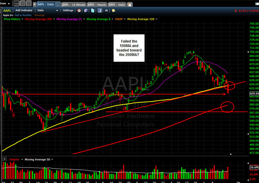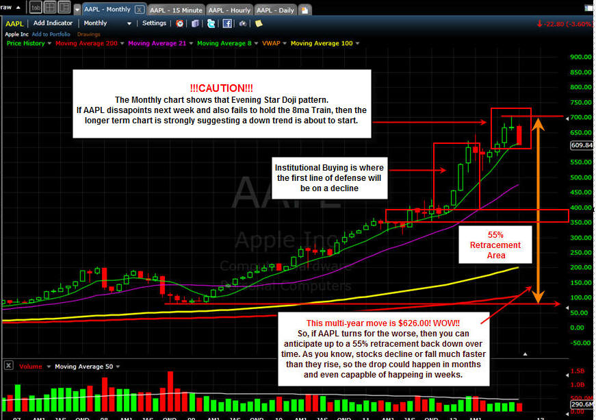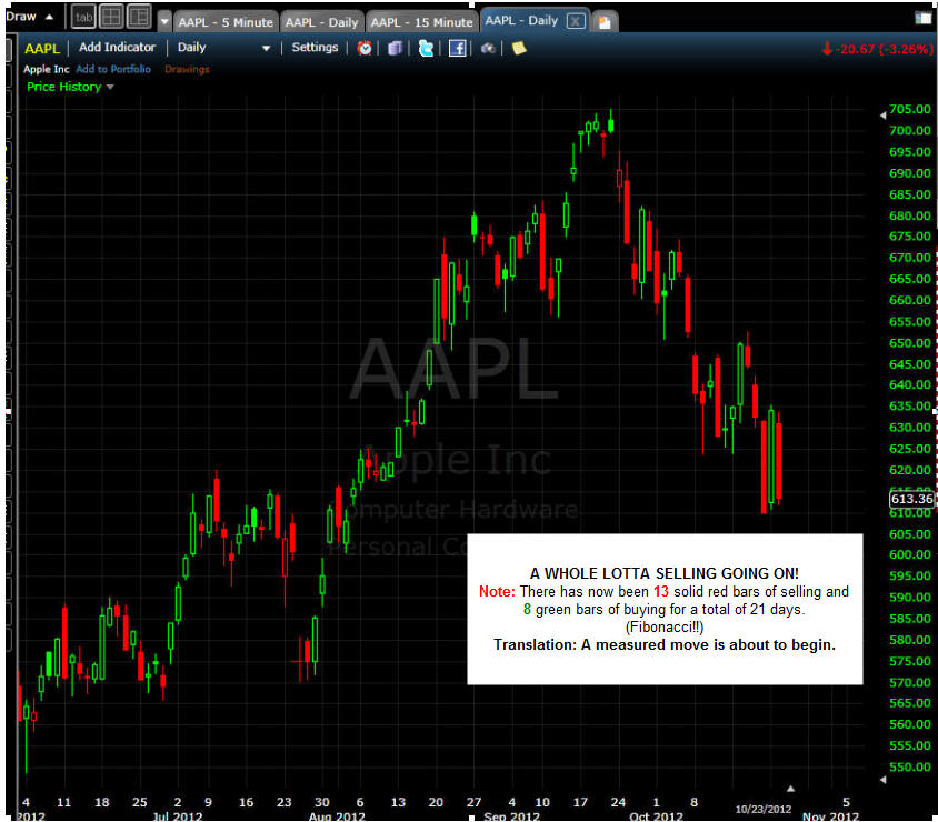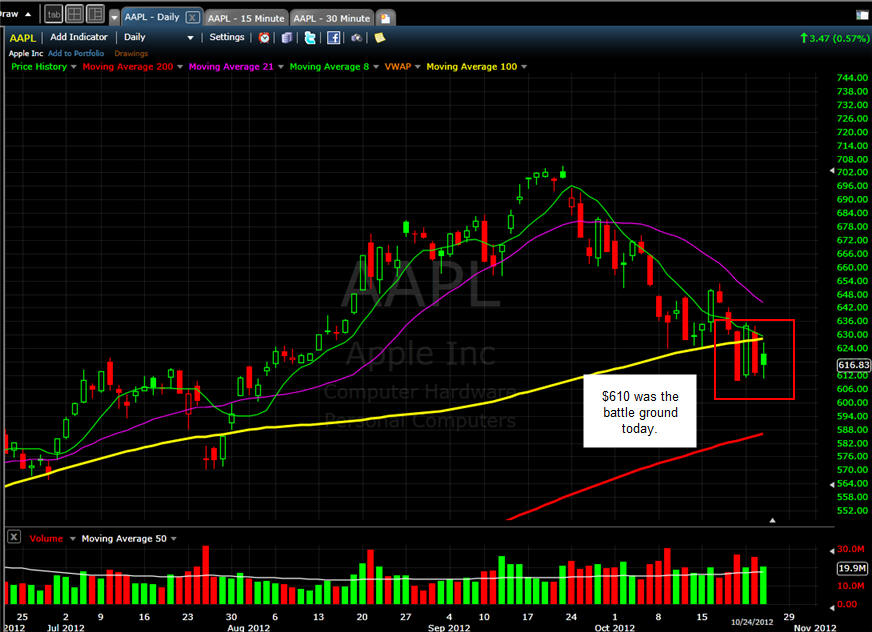 10/23/12 - Dah-dah-dah-dahhhh! And the winner is...missing in action...huh? The news conference was a smashing un-success to Apple's stock price today—unless you were shorting it!!. They announced several new products for devoted Apple dorks to gobble up including a new iPad, iMac, Mac Book Pro and the much anticipated iPad-mini with a retail price starting at $329.00. The price was expected to be under $300, but you know that AAPL always charges a premium for their products because, well, they're Apple dang-it!— and they always get away with a higher price. Even though this will translate into MORE profits down the road, the first reaction to the news was the price is too close to the iPad and might "cannibalize" sales; however, that was not the news that started a panic driving the stock rapidly down $15 in 10 minutes. That news was the announcement that Apple has sold 100 million plus iPads since their debut in Apirl of 2010. This number (although its not official yet until Thursday) equates to a potential revenue miss for this quarter and so the selling began. The stock was quickly snapped back up, but that did not hold and they slammed it down closing just above the low of the day. The line in the sand is going to be $610.00 tomorrow and when when the actual numbers are released on Thursday and if they surprise, I believe we stand a very good chance of getting a massive rally since the stock has been beaten down $100 from its all time high. On the other hand, if the numbers are indeed short of expectations, this stock could easily fall more than 10% on Friday.