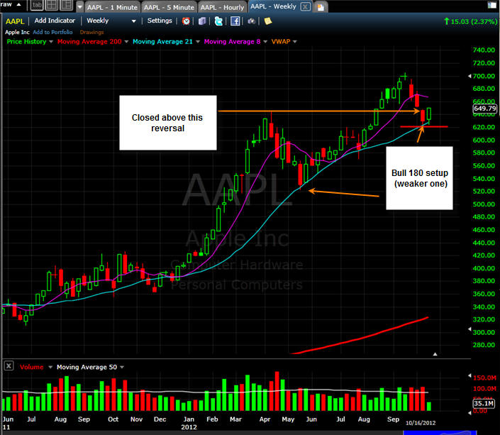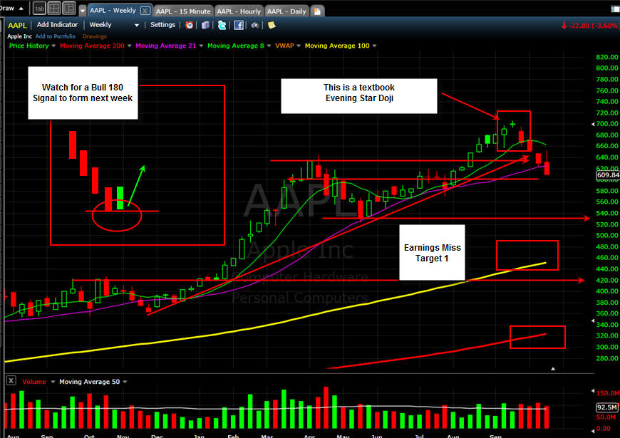 Next week we could get a nice Bull 180 setup. If AAPL opens up or gaps up and holds it after 7am, then I will start a call play, get long the stock with a strict stop at Friday's close. If the news event is well received, the stock WILL GO UP. If the earnings are a crusher, look out below; however, if they are a blow out, I expect a potential new all-time-high.