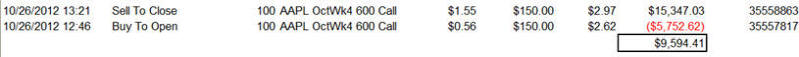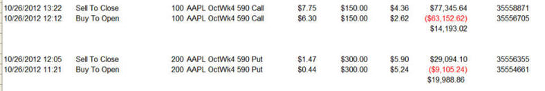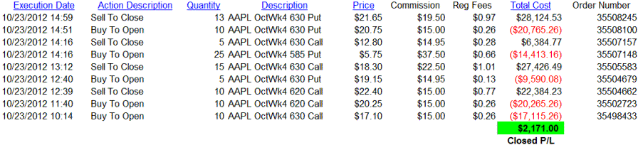 =========================================================================================== 10/24/12 - Tomorrow is the BIG day for AAPL. I am positioned on both sides and so all I need a 10% or greater move and I am ready to catch a whale. I will scalp some more stock tomorrow and add to my positions before the close.