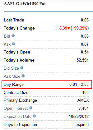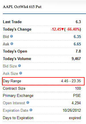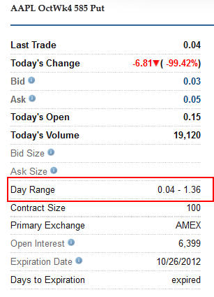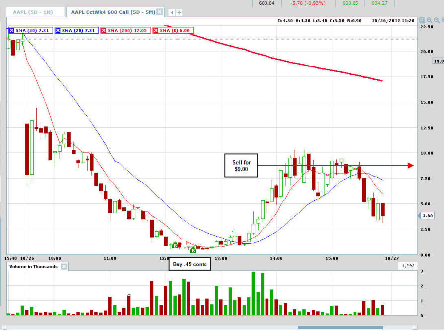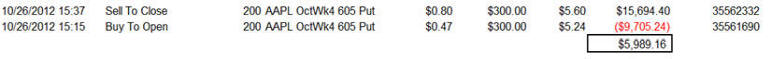 10/25/12- O.M.G what the heck is happing with the stock markets? What a pile of crap I have witnessed these past two weeks of trading. First it was GOOG pre-release (I am convinced was planned) that botched up trade opportunities if you were waiting until the end of trading to put on your positions. But even if you did, the move was totally controlled and since they stopped the trading for hours, market makers had plenty of time to get all their orders matched up and computers programmed to arbitrage the panic selling thereby propping up what should have been a freaking melt-down! Now comes my long anticipated trade on AAPL that I KNOW I WOULD HAVE BANKED but noooooooooo, this stock misses across the board, but trading was immediately stopped so they could, once again, set up arbitrage and put the screws to us put buyers. Come tomorrow, I am more convinced the stock will languish not dropping anywhere near the 10% projections I had and it SHOULD HAVE! Well, its looking like I have to just hunt for a lotto trade in the morning hopping for a sell off to kick in or a big rally to come. I do not think this stock will sell of anywhere near a 10% move, but you never know until the days trading is closed. With the GOOG bust and now that AAPL manipulation, my two most anticipated earnings Lotto Plays were a bust!! Not to worry, there will continue to be plenty of trading opportunities to make up for what should have been a massive winning trade.