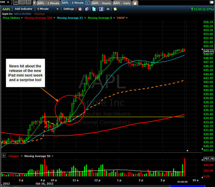 The donFranko ============================================================================================= 10/16/12 - Apple looks to have shaken off the selling and the race is on for higher ground! Apple announced a media invite for next week on 10/23/12. This ignited the stock today with a solid +$15.00 gain on good volume. I would have rather seen the volume well above average, but the buying was good and pronounced at every pull back on the 5 minute chart. What really got the stock going was a quote saying, "We've got a little more to show you." This is the kind of news that can really get this stock going and with earnings coming out next Thursday, we could have a massive explosion to the upside if that little more were say, a stock split! I will have to pick up a call on Monday just in case the announcement is spectacular and launches the stock ahead of earnings.