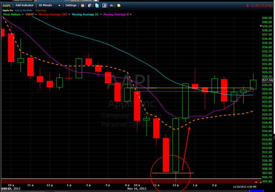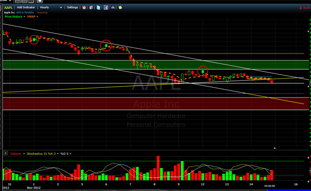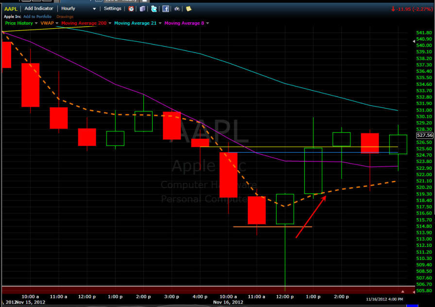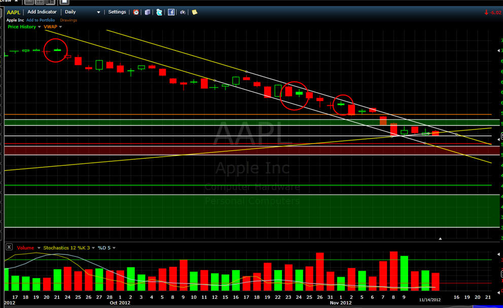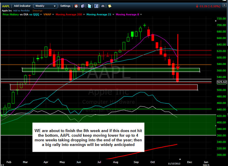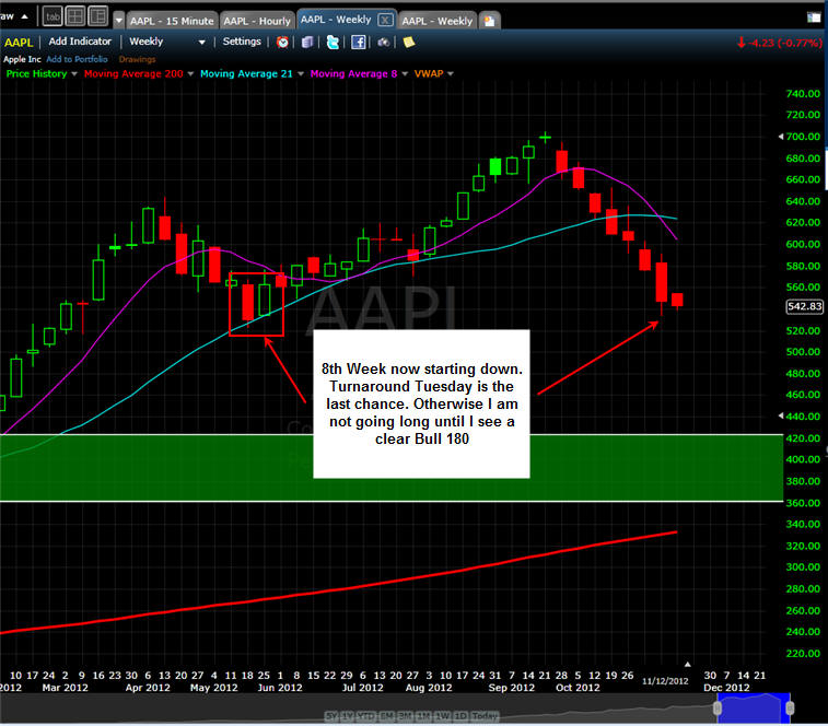 ============================================================================================ 11/14/12 - Capitulation day coming soon! AAPL traded flat most of the day and then sold off with rising volume in the last two hours of trading today. Take a look at all these time intervals below. You will notice they all have a similar candle pattern with a single SOLID green bar followed by continued selling. This is something I have been watching on this stock and now I have been seeing it on a lot of stocks I follow. When you see this happen, TRUST a short with a strict stop loss above the high of that reversal candle. This pattern, indicates big sellers are fading any gaps up. We are not in the 8th weekly drop so this is going to be a decision week for AAPL. I am hoping we get a capitulation day tomorrow and Friday will be the turn for higher ground so I will be putting on my straddle in the morning. If AAPL gaps up and holds it I will get long calls and then short puts at the end of the day unless AAPL takes out the low of the first 15-30min bar. If AAPL gaps down I will get aggressively long with calls if it holds the low after the first 5 - 15 minutes and if that fails I will buy the puts. The next measured move in AAPL should be 8 - 12% so be sure to pick your strikes that are within 8% to assure you have the best chance at a big profit!