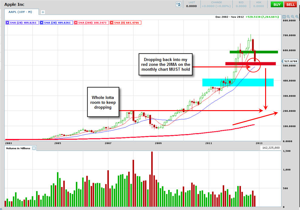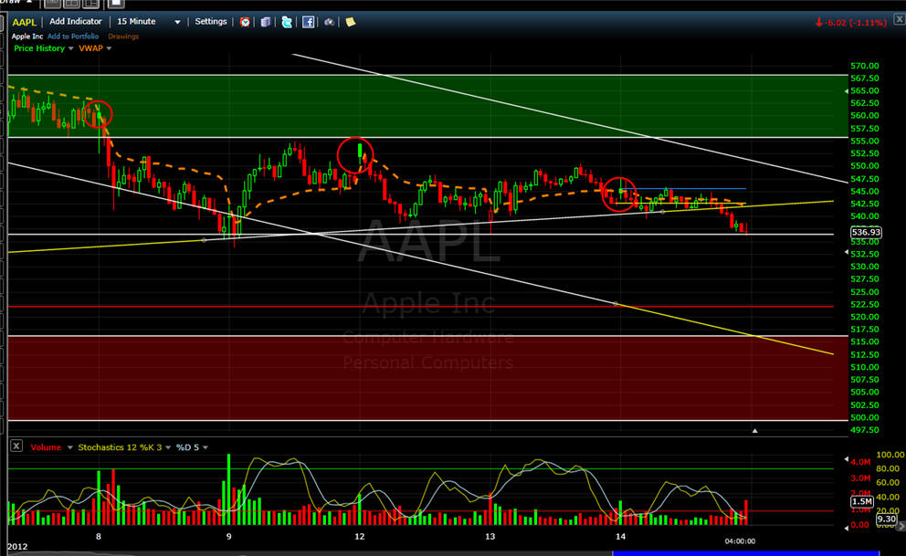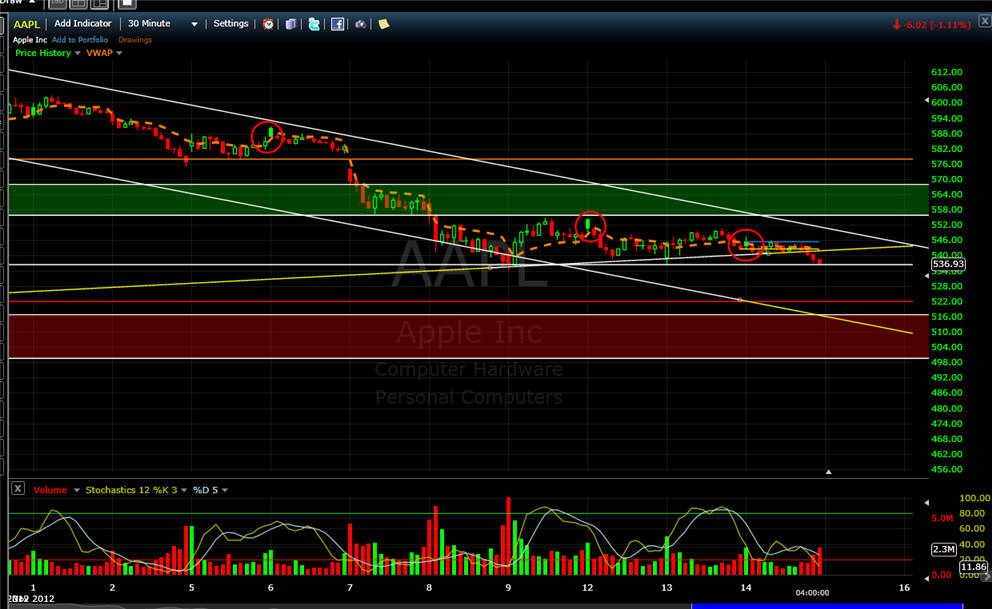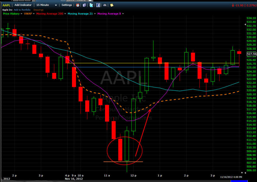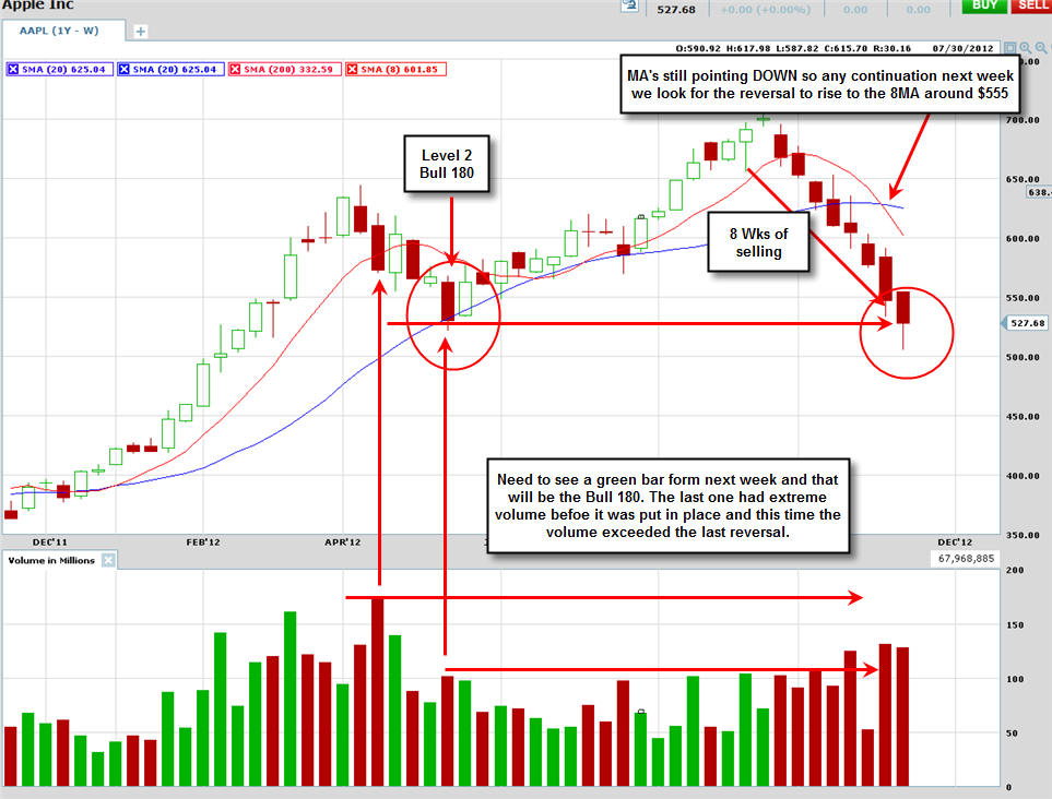 ============================================================================================ 11/14/12 - Capitulation day coming soon! AAPL traded flat most of the day and then sold off with rising volume in the last two hours of trading today. Take a look at all these time intervals below. You will notice they all have a similar candle pattern with a single SOLID green bar followed by continued selling. This is something I have been watching on this stock and now I have been seeing it on a lot of stocks I follow. When you see this happen, TRUST a short with a strict stop loss above the high of that reversal candle. This pattern, indicates big sellers are fading any gaps up. We are not in the 8th weekly drop so this is going to be a decision week for AAPL. I am hoping we get a capitulation day tomorrow and Friday will be the turn for higher ground so I will be putting on my straddle in the morning. If AAPL gaps up and holds it I will get long calls and then short puts at the end of the day unless AAPL takes out the low of the first 15-30min bar. If AAPL gaps down I will get aggressively long with calls if it holds the low after the first 5 - 15 minutes and if that fails I will buy the puts. The next measured move in AAPL should be 8 - 12% so be sure to pick your strikes that are within 8% to assure you have the best chance at a big profit!