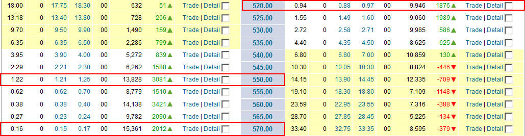 I would not buy puts lower than $520 and calls higher than 570 or $555 if the stock moves lower tomorrow.