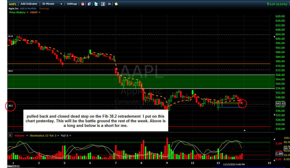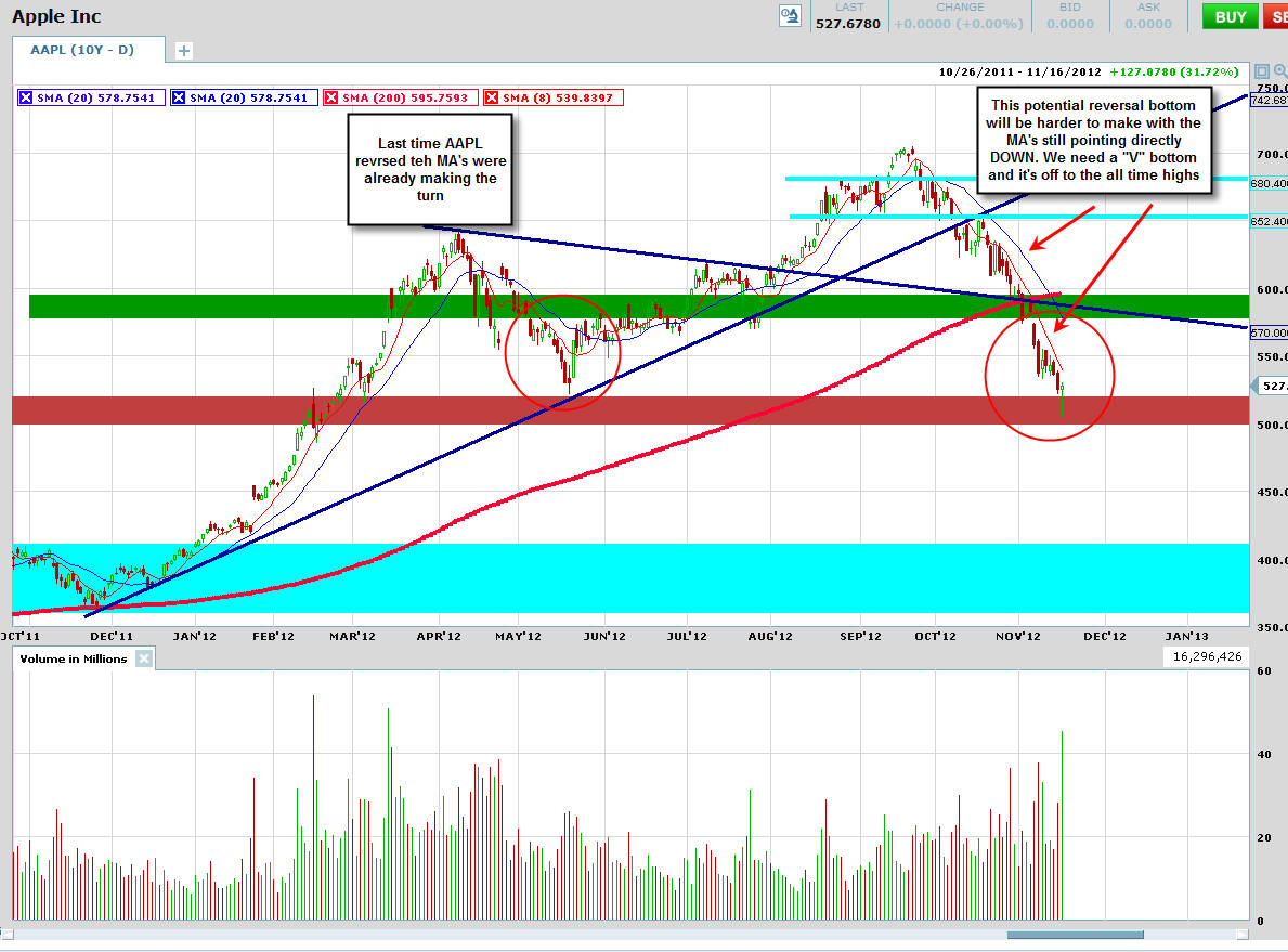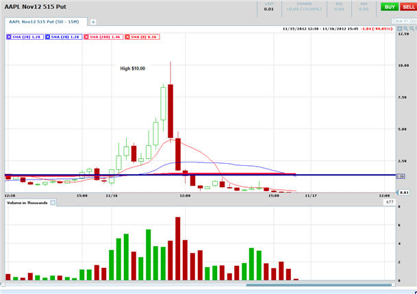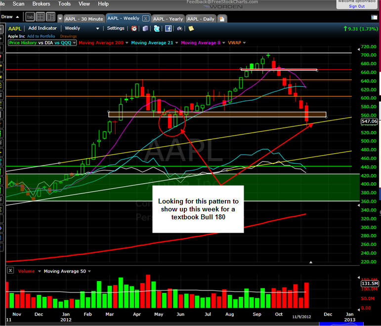 The donFranko ===================================================================================== 11/11/12 - With AAPL ready to make a solid Bull 180 reversal, I will put on a straddle by buying 10 of the Nov12 580 calls and 1 of the Nov12 545 Puts. I am looking for the stock to rise 8-10% this week. If this play works as planned, I expect to make up to $20k on the calls and that will more than pay for the loss on the puts. Total investment for this spread is $2475.00, so the stock has to move at least +6.5% to guarantee a break even. This does not take into account implied volatility which can make the profits happen faster. Depending how AAPL opens tomorrow will determine my entry points. If the stock gaps up in the morning and fails to hold the first 15 minute high, then I will start the PUTS and adjust my call strike accordingly if the stock moves back OVER the first 15 minute high. If the stock gaps down and starts to rebound back to the high of the first 15 minute bar, then I will start my calls and wait for a pull back to add the puts unless the stock holds the low of the first 15-minute bar. Then I will just keep calls on and follow up ready to add the puts by the end of the day. I will post my trades once I place them.
