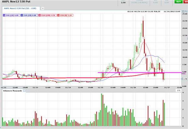 =========================================================================================== 11/12/12 - No follow through yet to the upside. AAPL gapped and crapped out on the first 15 minute bar. I shorted the stock and waited until later in the day to put on a straddle closer to the money