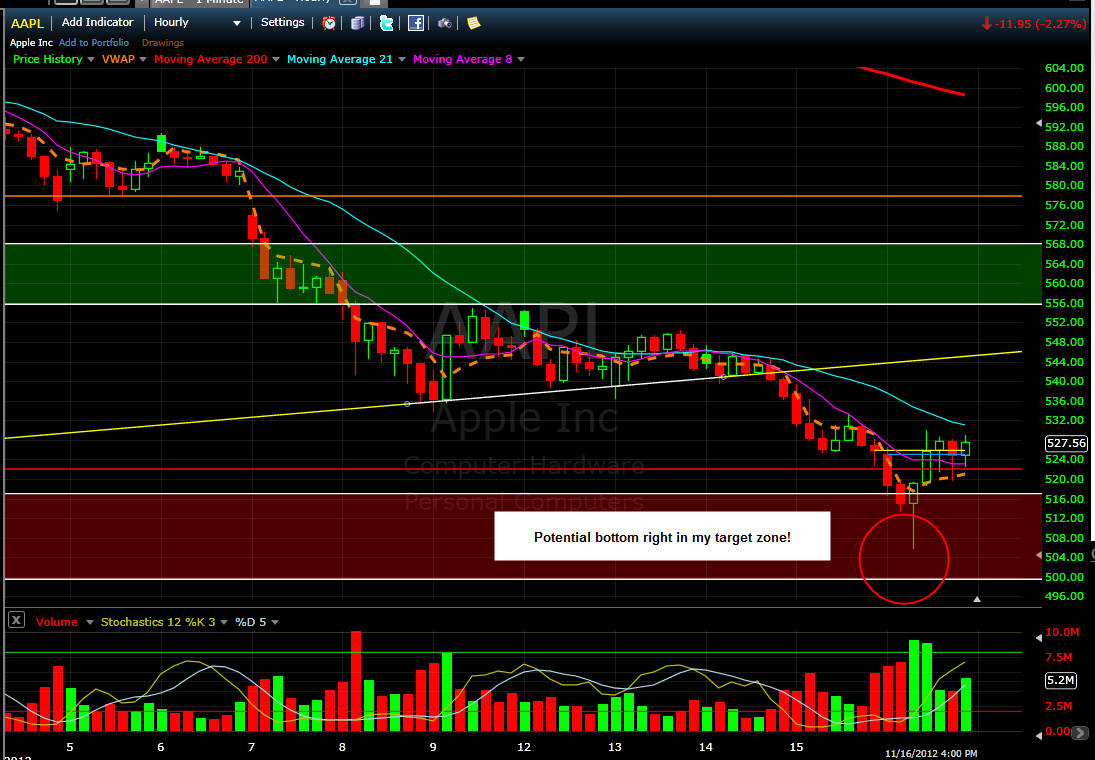 11/15/12 - AAPL went for the capitulation sweet spot just above $520 with a low of $522.62 today; however, I do not think today was enough and I am looking for one more down to $500. If we get a rally tomorrow, I would not trust it unless it powers back up over 5% and closes at the high of the day on very strong volume. I added 515 puts and 540 calls for tomorrow lotto trades.