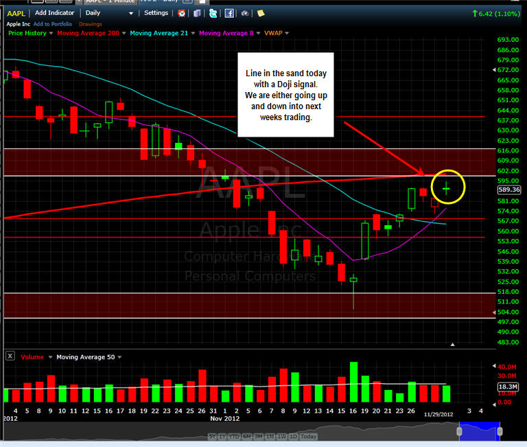 ========================================================================================= 11/29/12 - Another interesting day today trading AAPL. What started out as a gap up rally, was quickly sold off and the bounce was also sold off keeping AAPL under VWAP all day on the 15 minute chart. There was brief attempt to get over it after the Fiscal Cliff news of the day played out, but AAPL could not manage a comeback and traded flat the last hour of the day. In after hours it slipped lower, but that may be an intentional fake out for tomorrow. As you may know, tomorrow is the last trading day of November and there will no doubt be a lot of portfolio shuffling getting ready to take sides for the final month of trading for 2012. Will AAPL get polished and rise with seeds of greatness or will gravity be the catalyst and pluck this sucker down into a free fall testing the $505 bottom? Well, you could not get a better chart set up than today to make your case for either direction. The daily chart put in a perfect Doji signaling a change is a coming. I am the ultimate PUTomist, but I definitely like the future upside for the next two months as we start the Santa-Clause-hope-we-rally. The problem is this year brings all kinds of road blocks, scary world ending propaganda and even scarier TV watching all the crazy looking political nut balls spewing all day about fiscal, schmiscal, dismal, criminal bumblings we have to put up with. It just makes me sicker than a dog eating his vomit listening to all this bull rap. Bottom line, these leaches are going to make sure you and I get thoroughly screwed with future revenue collections and so that means we better get ready for a hell of a ride to povertyville. Ok, so where does that leave us when it comes to trading the big AAPL? Well, today I bought the 610 calls at the close and I will be ready to jump on the direction of the day tomorrow once trading starts. I will be looking for $0.10-20 cent options tomorrow and hope we get a measured move to round out the months trading. The rumblings in the news wires is a hope-call for AAPL to jump on the "special" year end dividend like LVS, COST and others have announced. If this were to happen, then AAPL will jump better than10% in a single day so I I am going to keep a call option going for the entire month just in case. As for a potential end of year trade opportunity, Crame says AAPL is the best of breed and you can buy, buy, buy. I suggest you take that with a handful of salt but he may be right this time. Either way, I am a day trader so I just want this stock to make big moves and I will continue to make BIG BUCKS!.